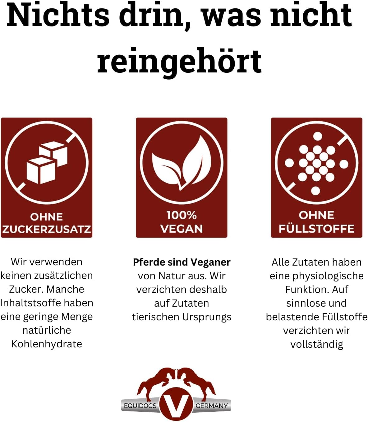 Natürlich und vegan: ausschließlich aus natürlichen und veganen Zutaten hergestellt. Dies entspricht der natürlichen Nutzung des Pferdes und gewährleistet eine hohe biologische Verfügbarkeit der wertvollen Inhaltsstoffe. Kein zugesetzter Zucker und keine belastenden Füllstoffe.