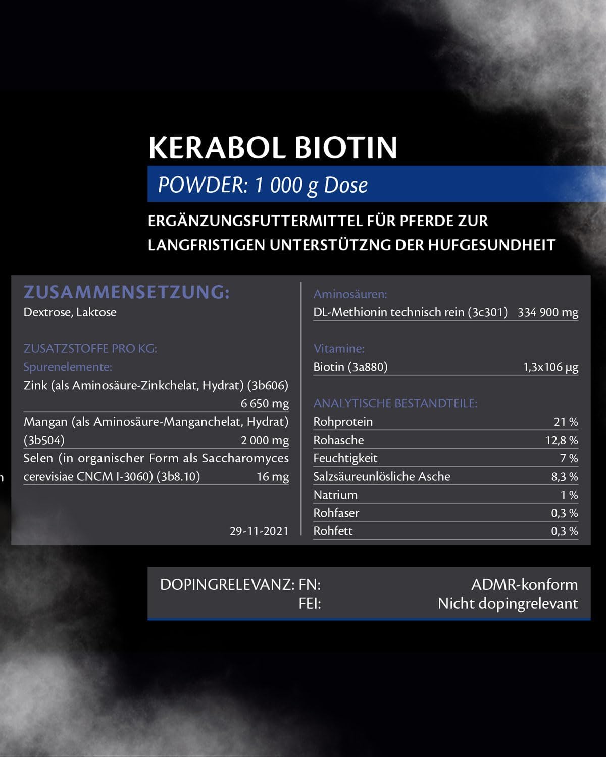 Equistro Kerabol Biotin ist ein Ergänzungsfuttermittel, das die Bildung von gesundem Huf und Fell unterstützen soll. Kerabol Biotin enthält eine Kombination aus Biotin, DL-Methionin (organische Schwefelquelle) und hochverfügbarem Zink, Mangan (IPALIGO-Spurenelemente) und Selen (Sel-Plex). Anwendungsempfehlung: Die tägliche Anwendung von Kerabol Biotin fördert sowohl gesunde Hufe (mehr Elastizität und Geschmeidigkeit, gegen bröckelndes oder brüchiges Horn) als auch seidig glänzendes Fell.