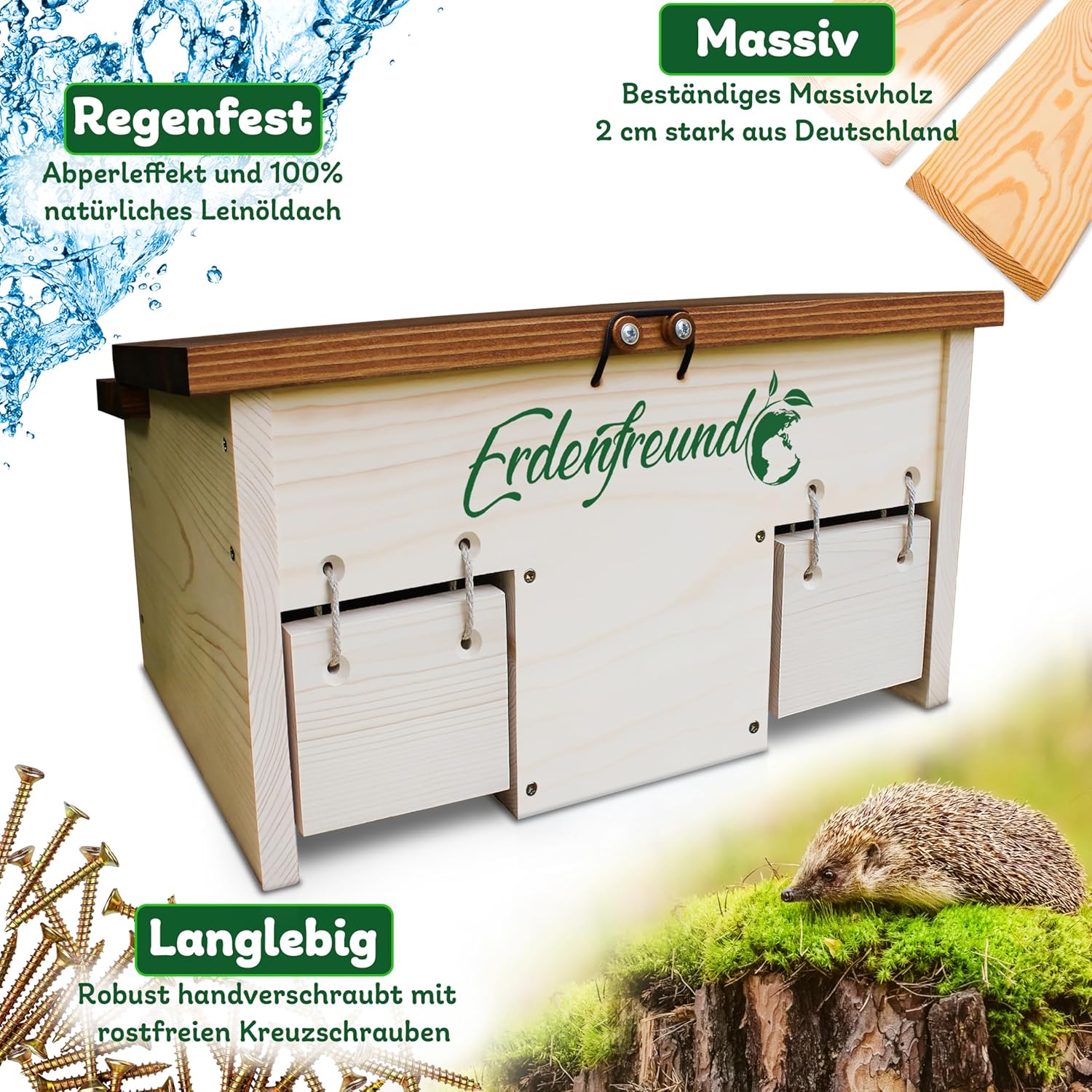 Material 2 cm starkes deutsches Massivholz aus regionaler Forstwirtschaft Langlebigkeit Überdurchschnittlich lange Lebensdauer durch hochwertige Handarbeit Herstellungsart Hochwertig regional in der Pfalz (Deutschland) per Hand verschraubt, unterstützt von gehandicapten Menschen Wasserfestigkeit Wetterfest und wasserabweisend mit Erdenfreund H2O-Abperleffekt dank natürlichem und tierfreundlichem Erdenfreund Tierhaus Schutzöl Herstellungsland In Deutschland, Rheinland-Pfalz, 67310 Hettenleidelheim (Erdenfreund Produktion) Verarbeitung 2 cm starkes Massivholz handverschraubt mit extra starken rostfreien Kreuzschrauben Befestigung Einfache Anbringung dank maßgeschneiderter Vorrichtungen wie Schraubenfassungen, Bohrungen oder Kordeln