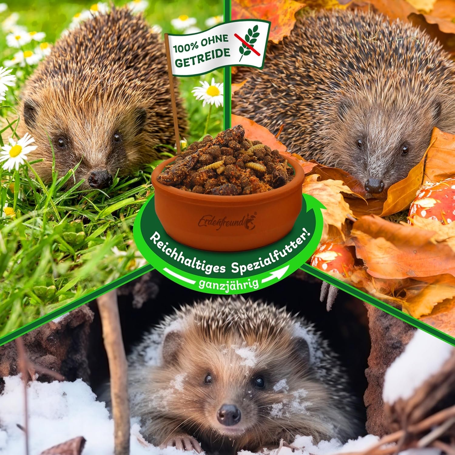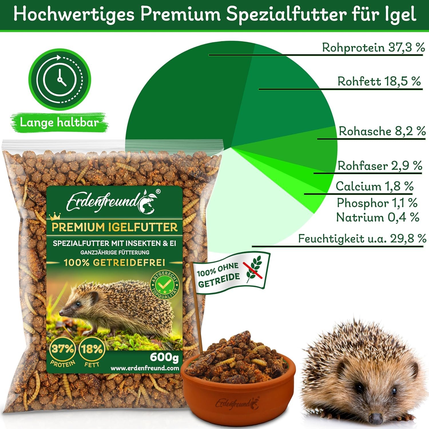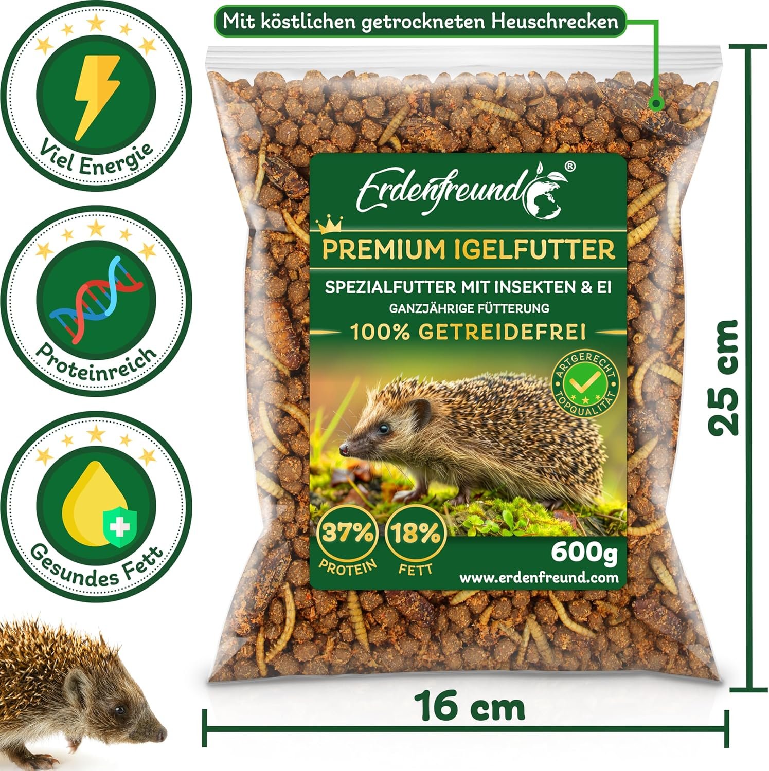 100 % artgerecht: Erstklassiges Alleinfuttermittel für Igel, artgerecht entwickelt mit Heuschrecken, Seidenraupenpuppen, Einsiedlerlarven, Mehlwürmern, Ei, Geflügel und Rind. Kein Getreide, Nüsse, Obst…!