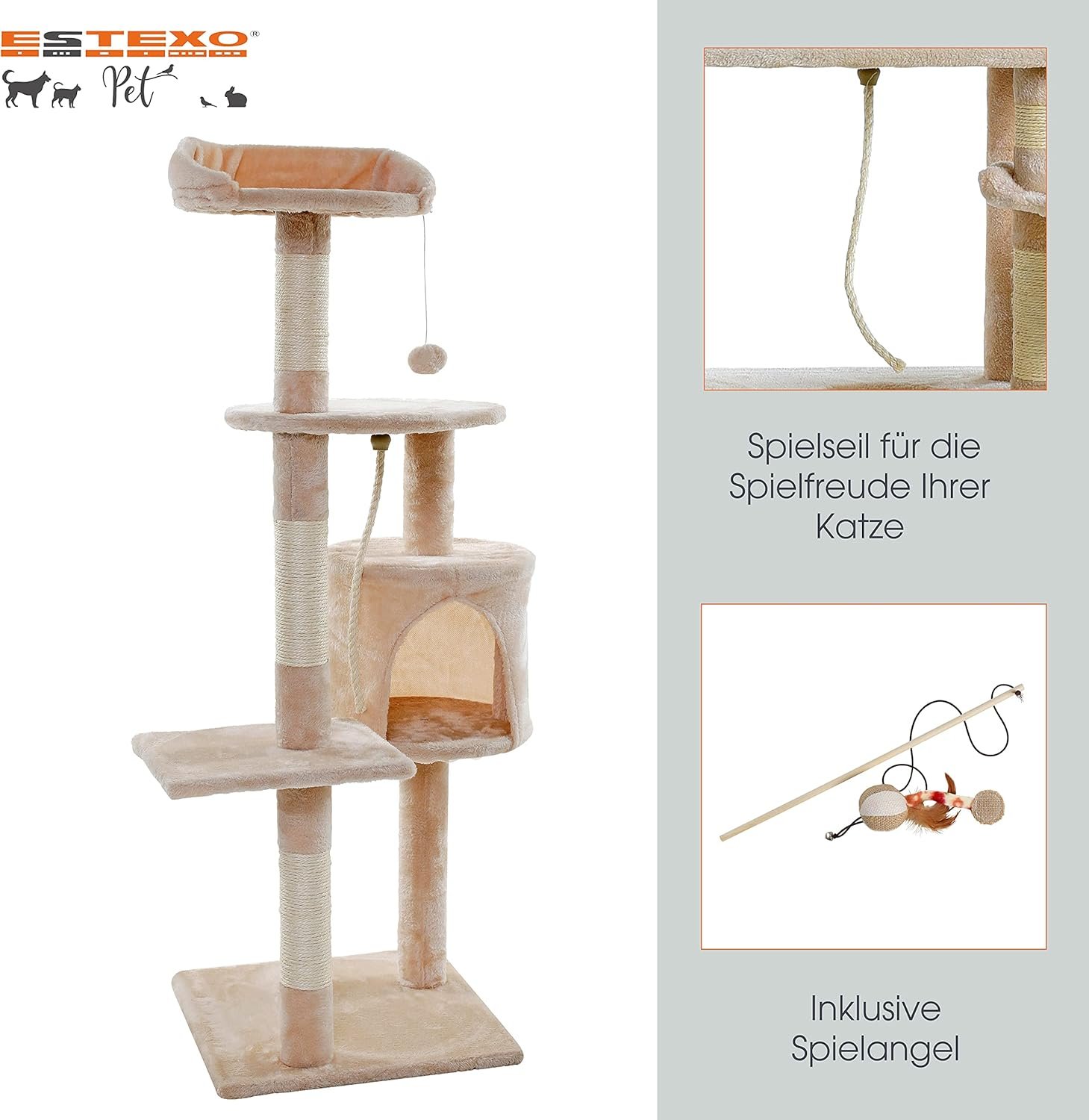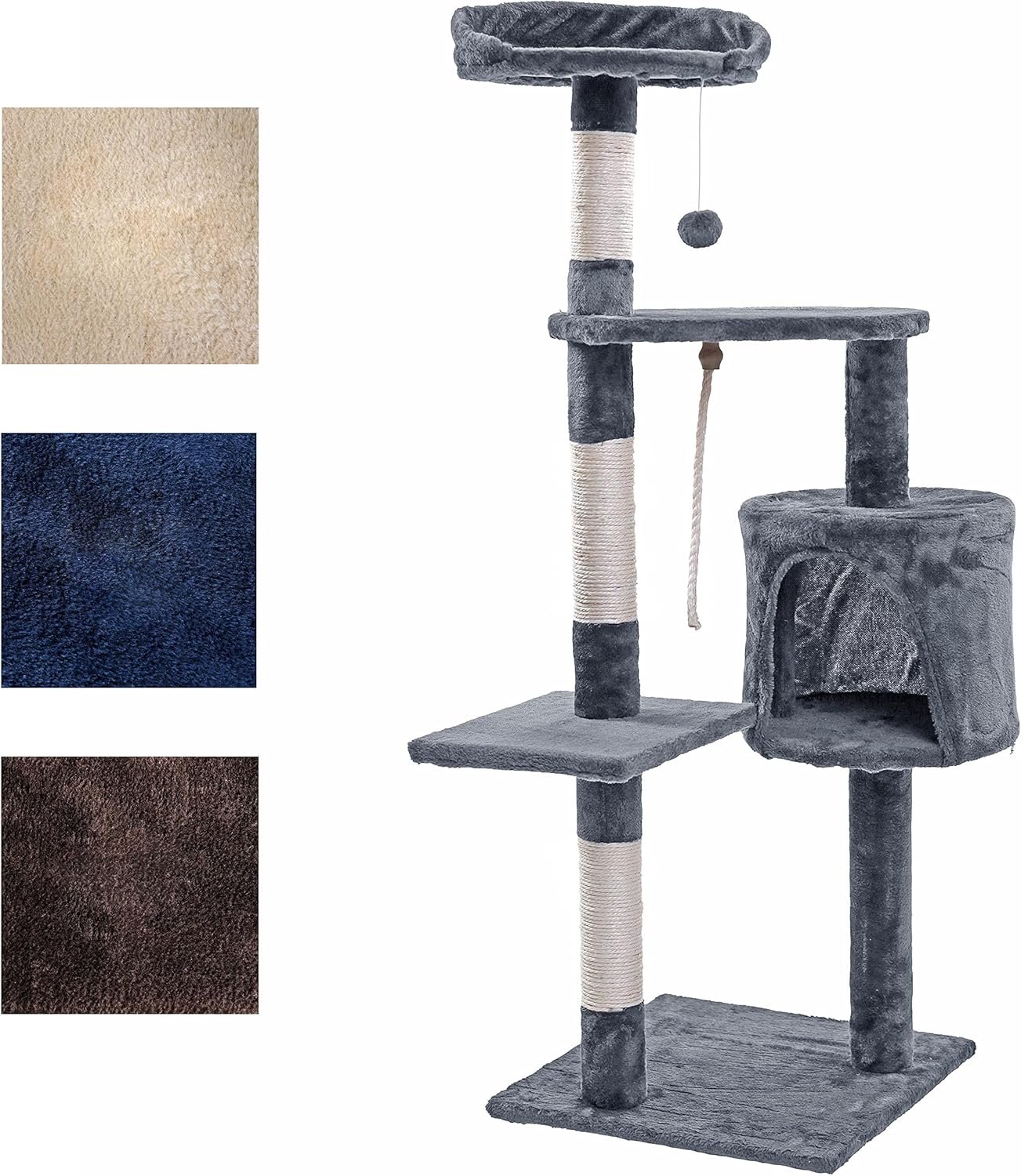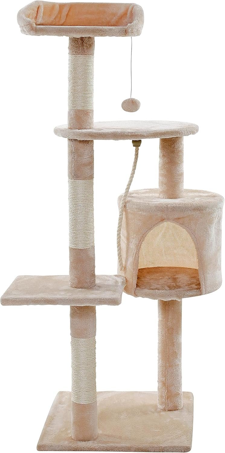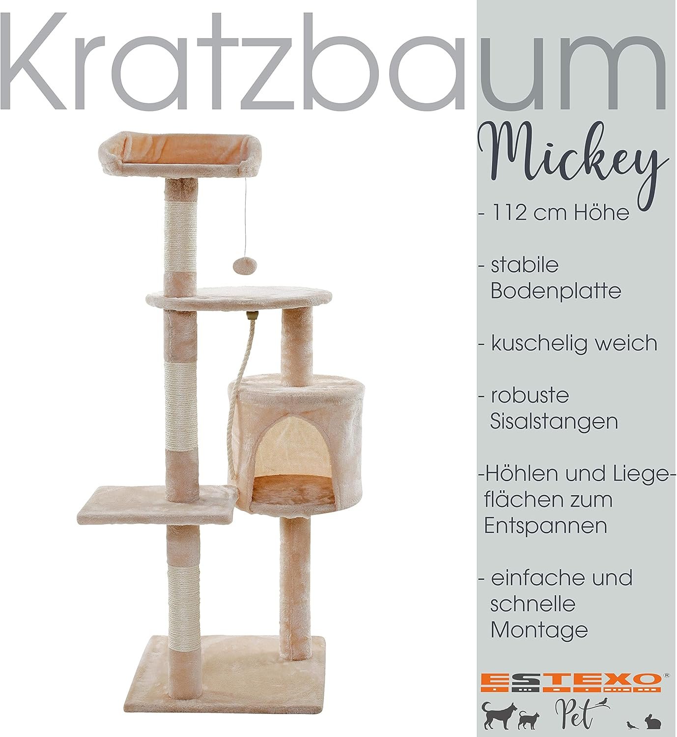 Unser 112 cm hoher Kratzbaum ist in 4 verschiedenen Farben erhältlich. Es bietet zahlreiche Möglichkeiten zum Spielen, Krallenwetzen und Entspannen. Auf den verschiedenen Ebenen gibt es viel zu entdecken: 3 gemütliche Liegeflächen, Höhlen zum Verstecken und vieles mehr.