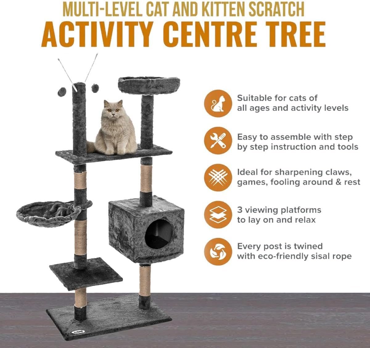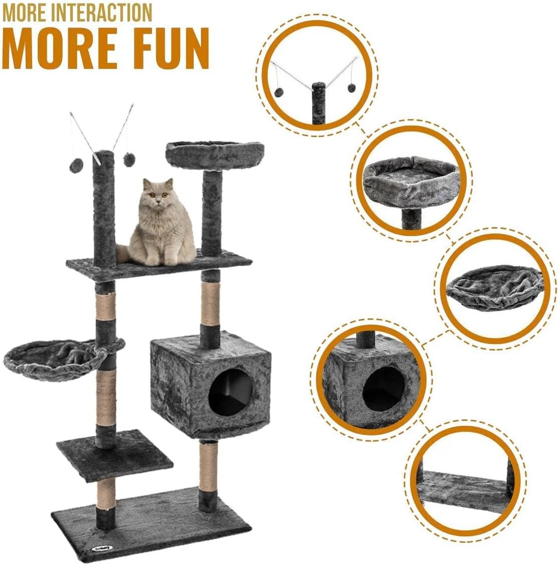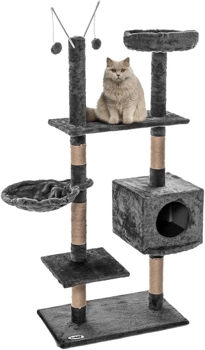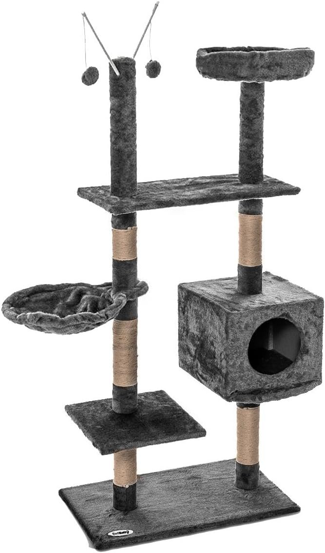 Unser vielseitiger Kratzbaum, der stolze 150 cm in die Höhe ragt, lädt Ihre geliebte Katze in ein wahres Paradies zum Spielen, Krallenpflege und Entspannen ein. Die drei großzügigen Ebenen dieses Premium-Kratzbaums eröffnen Ihrer Samtpfote vielfältige Möglichkeiten zum Entdecken und Unterhalten. Gönnen Sie Ihrer Katze den Luxus von drei gemütlichen Liegeflächen, auf denen sie nach Herzenslust dösen und träumen kann. Eine einladende Höhle bietet zudem den idealen Rückzugsort zum Verstecken und Ausruhen – ein perfekter Ort für kleine Katzenabenteuer oder einfach nur für die wohlverdiente Ruhe. Dieser Kratzbaum vereint stilvolles Design mit funktionaler Raffinesse und wird nicht nur Ihre Katze erfreuen, sondern auch zu einem echten Highlight in Ihrem Zuhause werden. Sichern Sie sich jetzt dieses exklusive Möbelstück und schenken Sie Ihrer Katze ein eigenes kleines Reich, in dem sie sich rundum wohlfühlen kann.