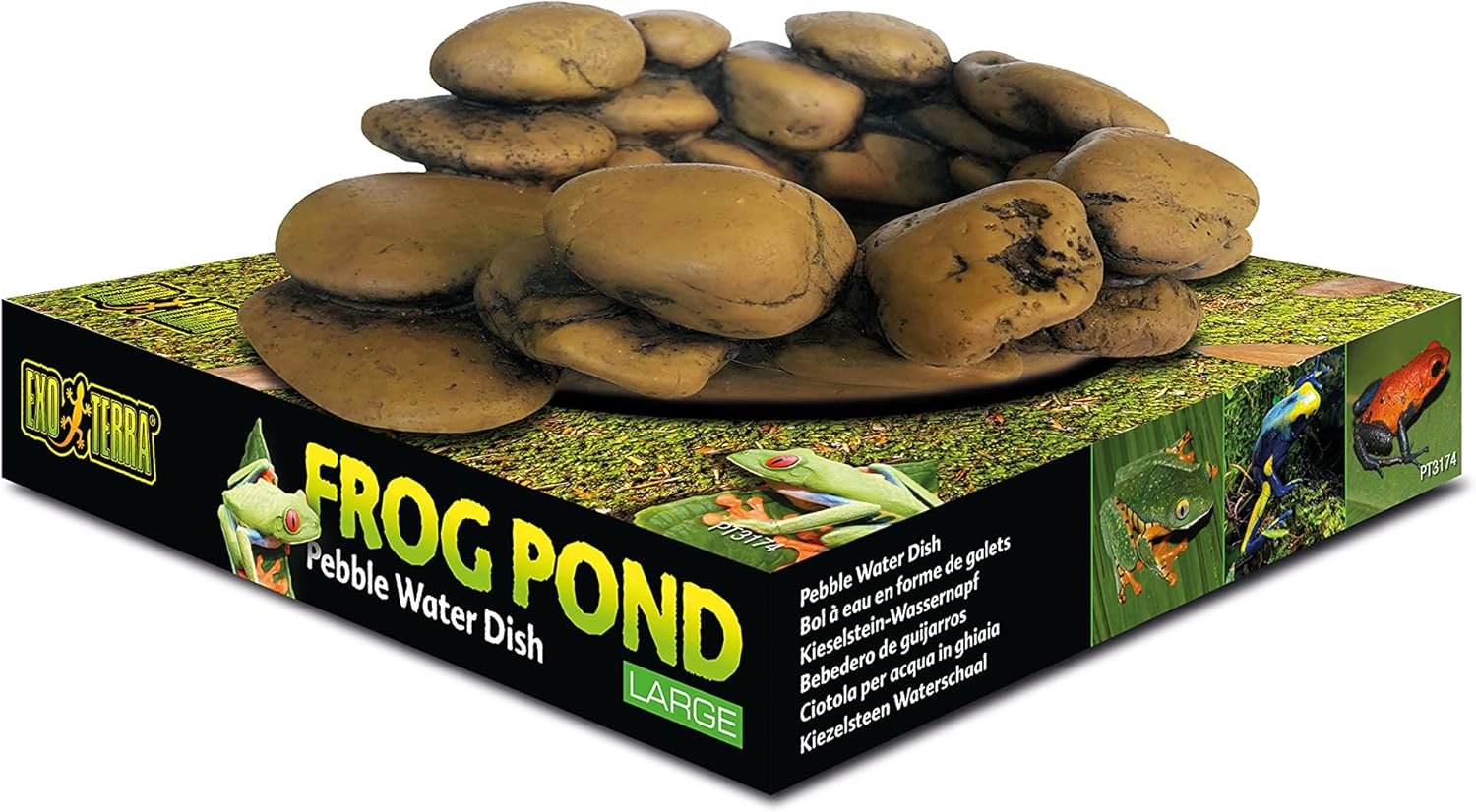 Amphibien trinken kein Wasser, sondern decken ihren Feuchtigkeits- und Ionenbedarf durch Osmose über ihre Haut. Sie nehmen Wasser über ihre wasserdurchlässige Haut aus der Feuchtigkeit ihrer Umgebung auf oder sitzen mit ihrem Hinterteil im flachen Wasser und nehmen Feuchtigkeit auf. Da sich die meisten Amphibien in vorübergehend oder dauerhaft flachen Gewässern vermehren oder ihre Kaulquappen in diese flachen Gewässer bringen, ist der Exo Terra Pebble Water Bowl ein wichtiger Bestandteil jedes tropischen Terrariums.