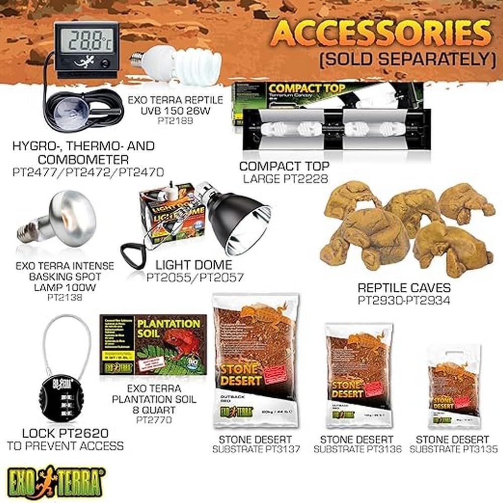 Das Exo Terra Terrarium ist tiefer als „aquarienähnliche Terrarien“ und verfügt somit über eine größere Grundfläche. Dies gewährleistet den Raum, den Wüstentiere und bodenlebende Reptilien und Amphibien für ihr Wohlbefinden benötigen.
