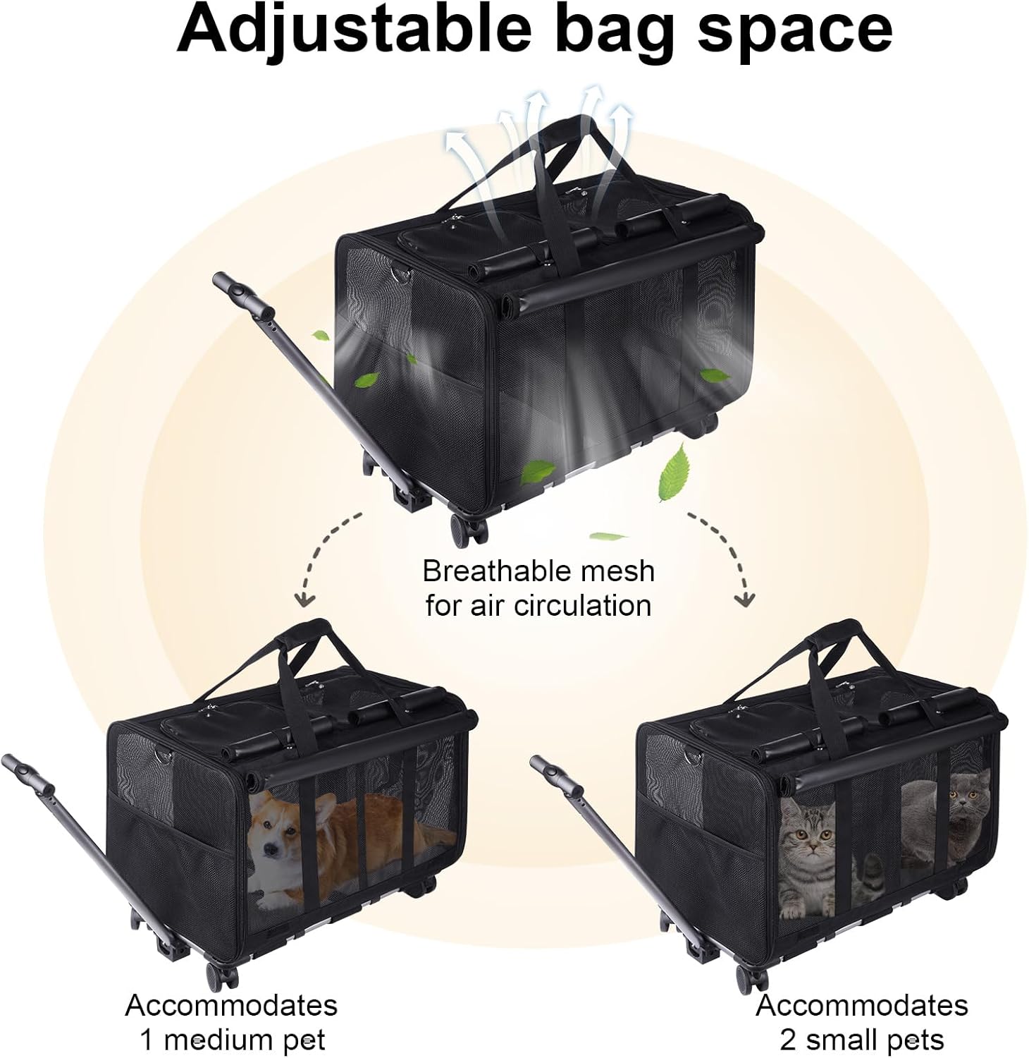 Multifunktionaler Haustierwagen. Diese Haustiertasche verfügt über eine Basis mit Rädern, die in der Hand gehalten oder geschoben und gezogen werden kann. Praktisch, damit Sie Ihr Fellkind zum Einkaufen, auf Reisen oder in die Tierklinik mitnehmen können. Mit diesem Trolley müssen Sie nicht mehr mühsam mehrere kleine Katzen und Hunde aus dem Haus tragen.