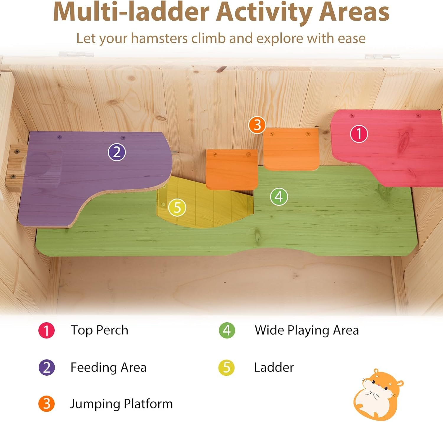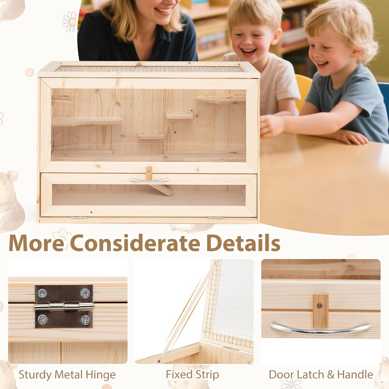 Dieser Hamsterkäfig bietet ein praktisches Faltdach mit festem Streifen zur einfachen Beobachtung und Fütterung Ihrer Haustiere. Das Drahtgeflecht an der Oberseite sorgt für hervorragende Belüftung und verhindert, dass Hamster entkommen. Die abschließbare Tür ermöglicht eine mühelose Reinigung des Innenraums. Der Käfig bietet einen großzügigen Lebensraum für verschiedene Kleintiere wie Hamster, Meerschweinchen, Igel, Küken und Leguane. Die langlebige, klare Acrylscheibe bietet eine klare Sicht auf Ihre Haustiere. Ausgestattet mit mehreren Leiter-Aktivitätsbereichen, darunter einer oberen Sitzstange, 2 Sprungplattformen, einem Futterbereich, einem Ruhebereich und einer Leiter, können Hamster problemlos klettern und erkunden. Daher ist dieser Holzkäfig ideal für Kleintiere wie Hamster, Meerschweinchen, Leguane und Igel.