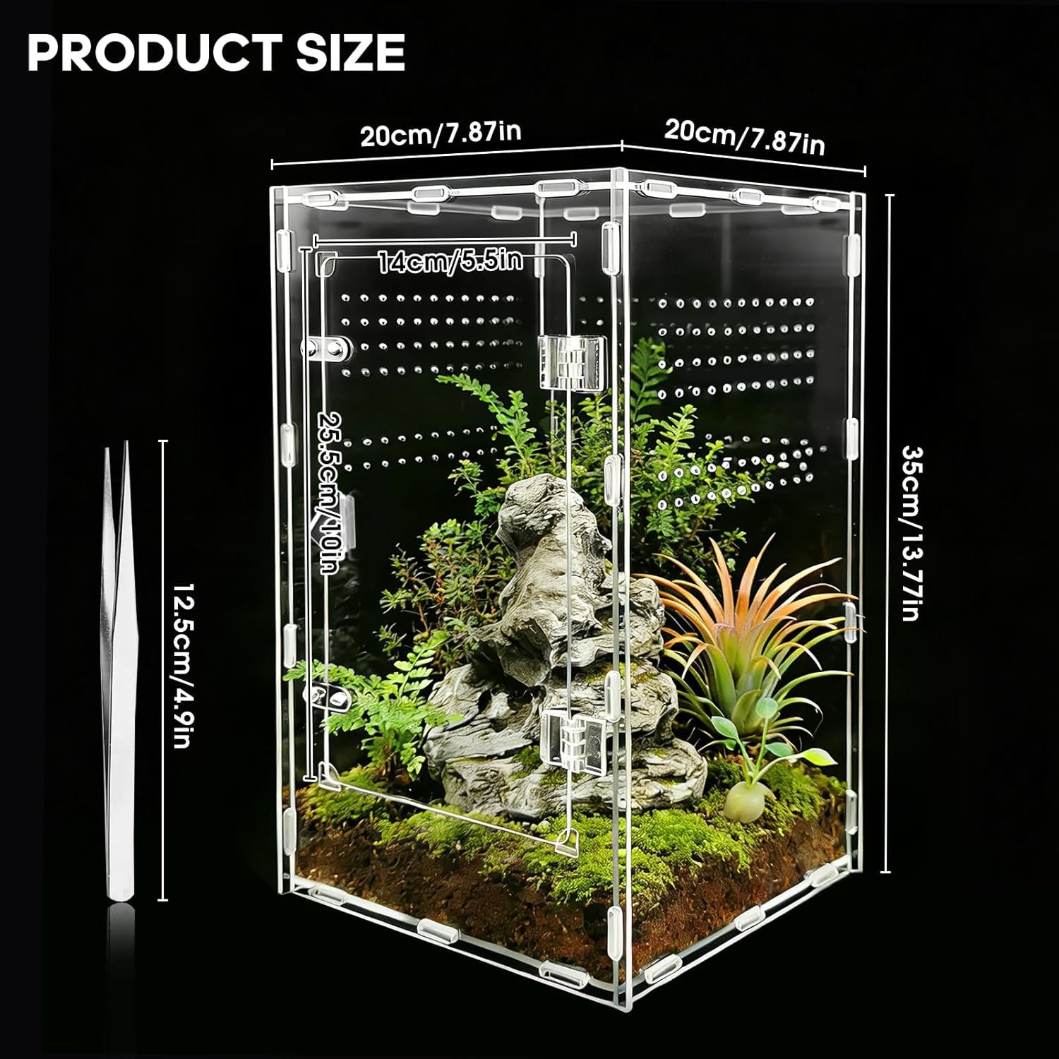 Kompakter, aber geräumiger Wohnraum: Dieses Acryl-Terrarium misst 20 × 20 × 35 cm und bietet ausreichend Platz für Jungtiere und kleine Reptilien. Ideal für Baby-Reptilien und andere Kleintiere.