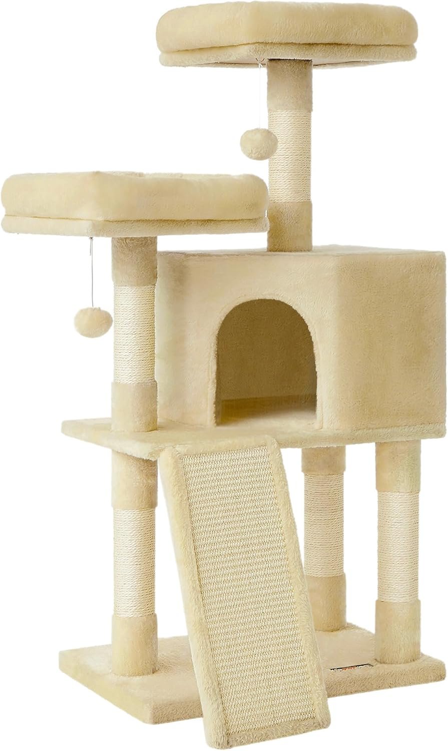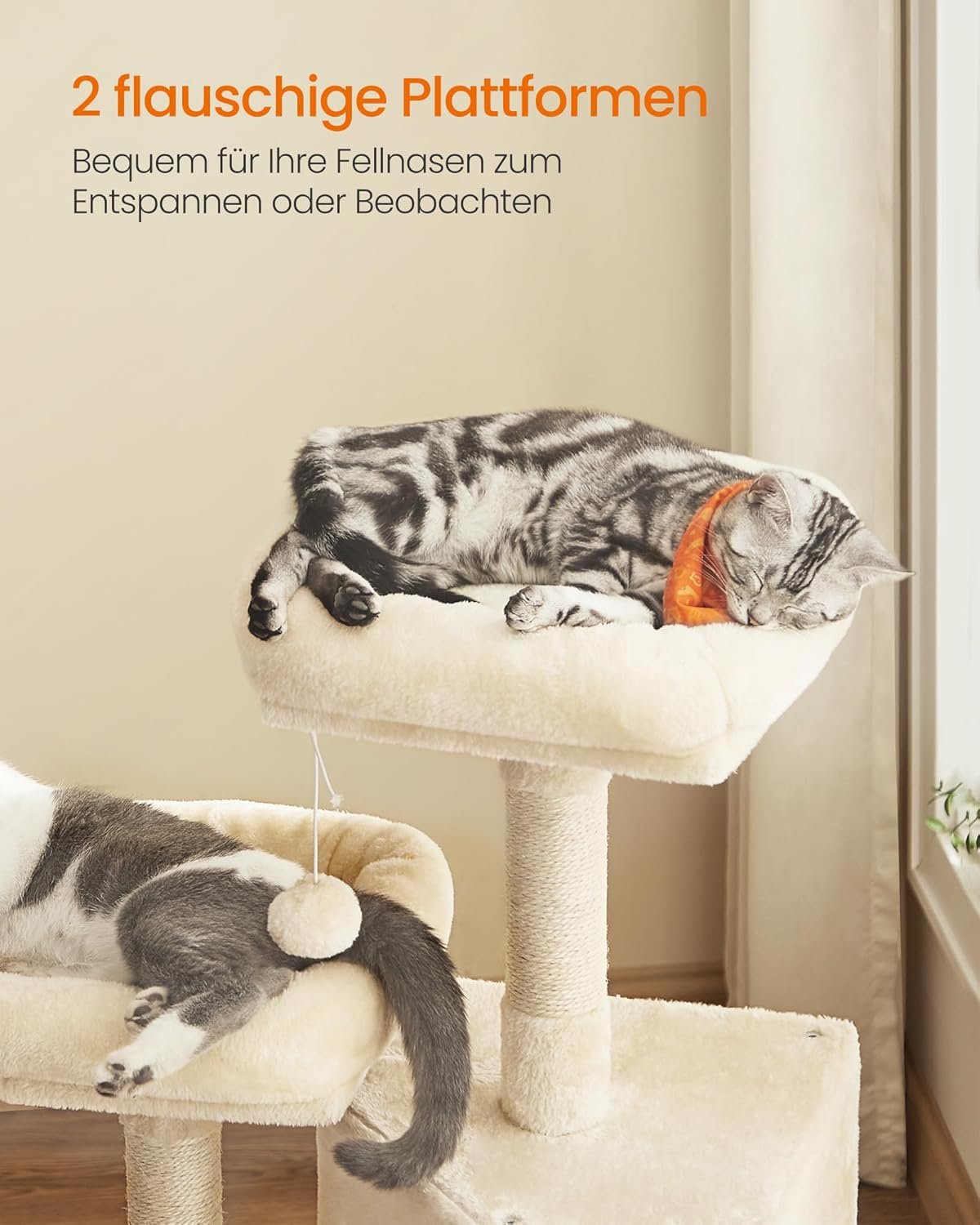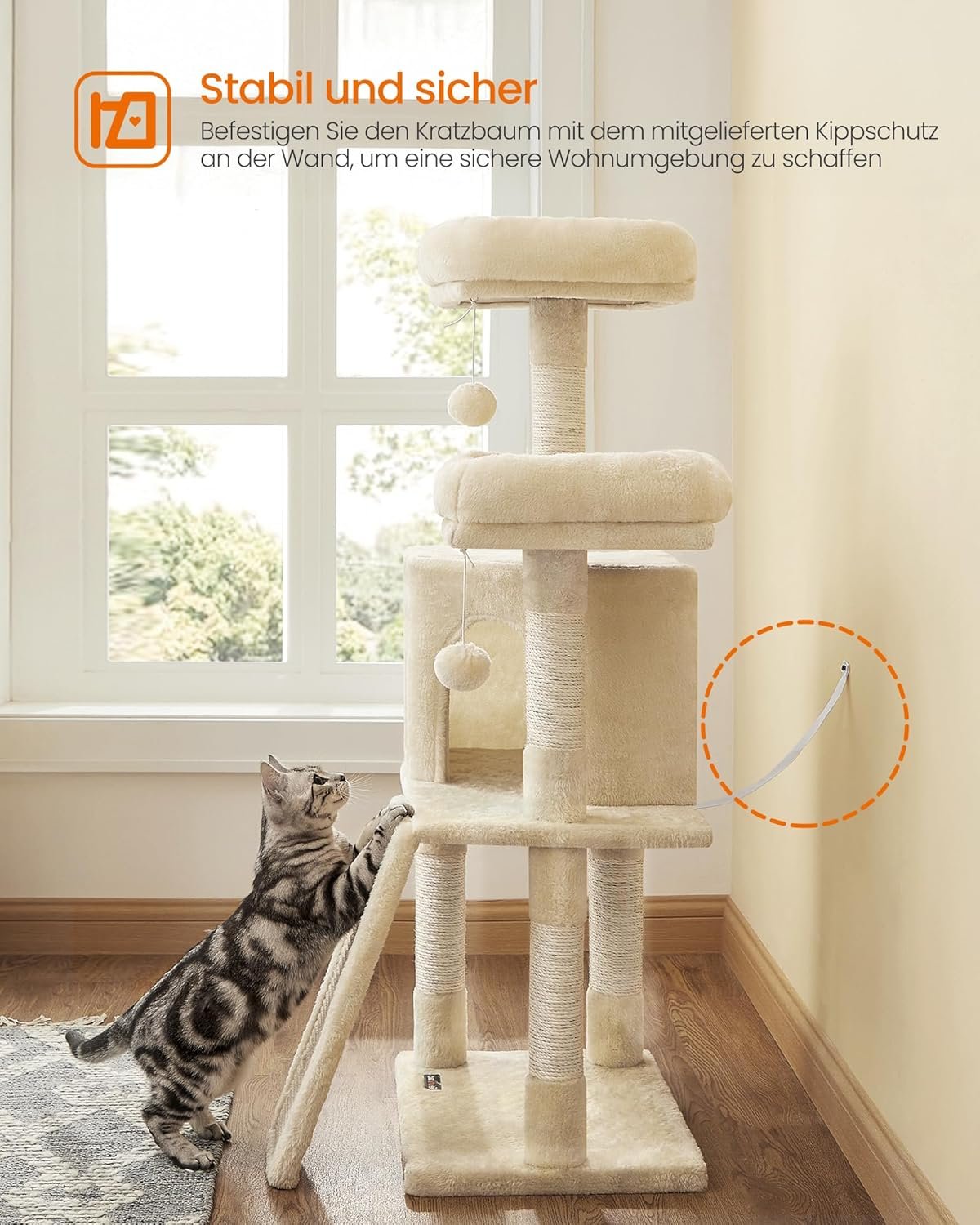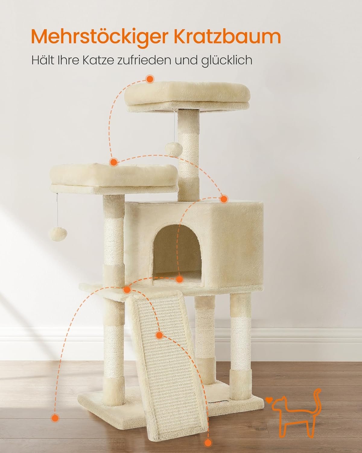 2 Aussichtsplattformen oben zum Beobachten, 1 gemütliche Kuschelhöhle für Versteckträume mit Sisal auf jeder Ebene, zum Wetzen der Krallen, 1 großes Kratzbrett, das gleichzeitig als Treppe dient, Stufenaufbau für einfaches Auf- und Absteigen, 2 Fellbälle für zusätzlichen Spielspaß