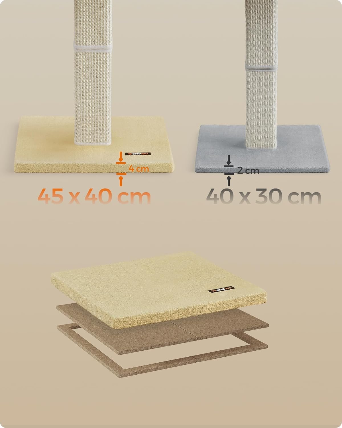 Stabiler Halt: Die Maße der Standfläche betragen 45 x 40 cm und der Kratzbaum bleibt stabil, wenn Katzen daran kratzen. Der Kippschutz befestigt den Kletterbaum an der Wand und sorgt für Sicherheit, wenn Katzen darauf springen
