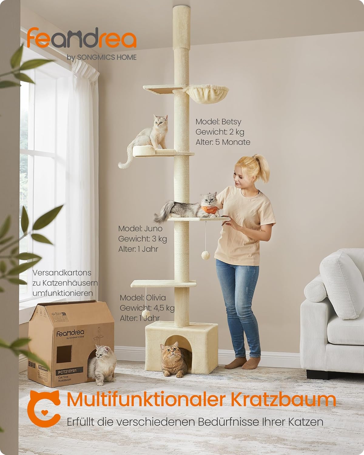 Geeignet für verschiedene Höhen: Mit 2 Ersatzsäulen und 1 verstellbaren oberen Schraube ist dieser Kratzbaum höhenverstellbar (231–291 cm) und bietet Ihren Katzen ausreichend vertikalen Raum, um etwas Neues zu entdecken