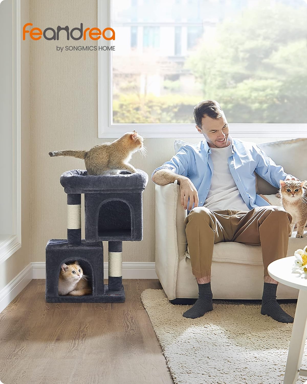 Klettern, kratzen, entspannen: Das mehrstufige Design erleichtert den Auf- und Abstieg. 2 Sisalstämme eignen sich perfekt zum Kratzen. Die Plattform oben ist ideal zum Beobachten. 2 Höhlen laden zum Entspannen ein