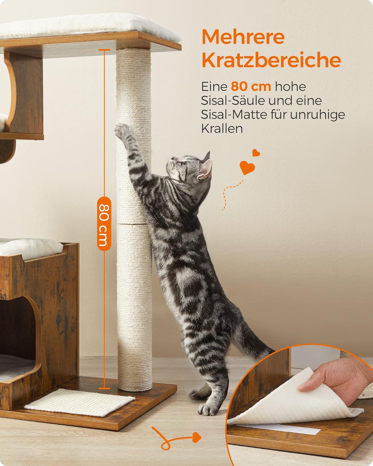 Mit diesem Kratzbaum ist alles möglich. Wilde Abenteurer können die Plattformen erkunden, sportliche Katzen können sich auf der Kratzmatte auspowern und die gemütliche Höhle wartet auf scheue Kätzchen.