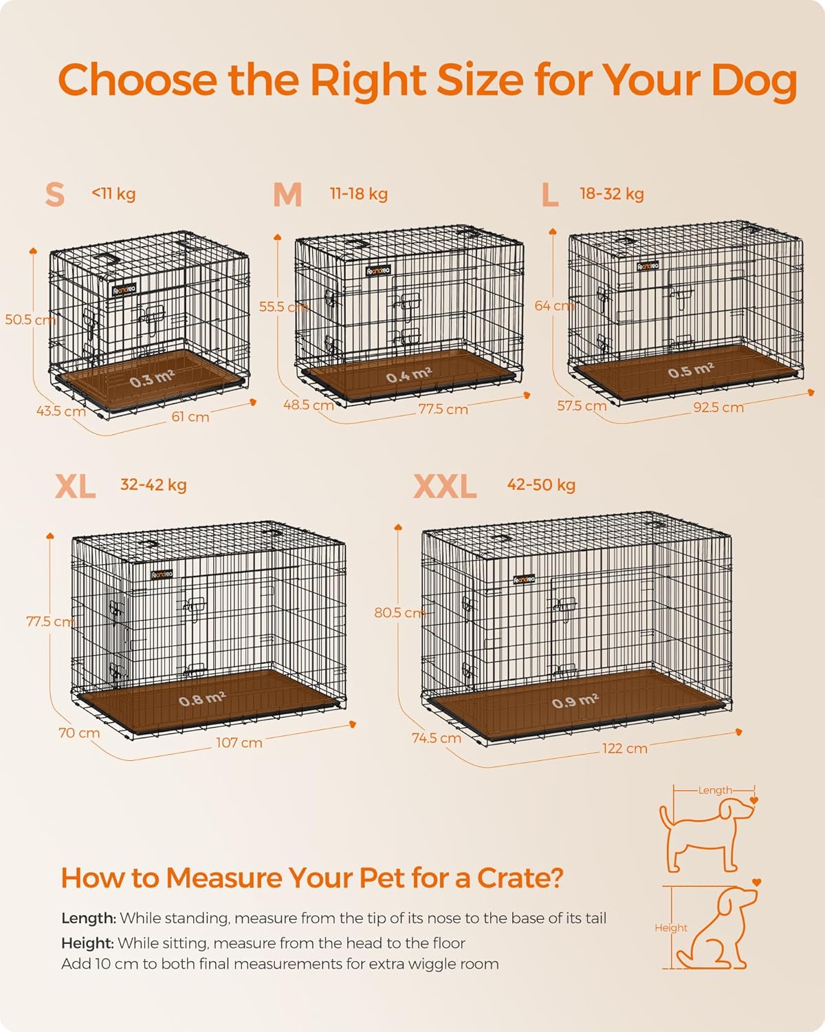 Bestimmen Sie die richtige Größe: Diese 122 x 74,5 x 80,5 cm große Transportbox ist für Hunde mit einem Gewicht zwischen 42 und 50 kg geeignet. Empfohlene Rassen: Deutscher Schäferhund, Alaskan, Golden Retriever usw. Befolgen Sie die Anweisungen für die richtige Messmethode.