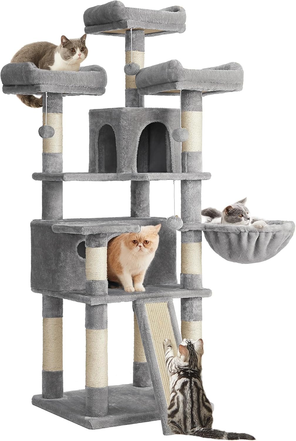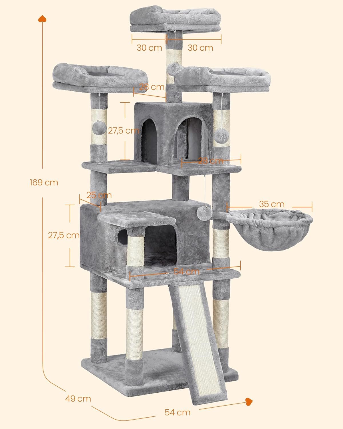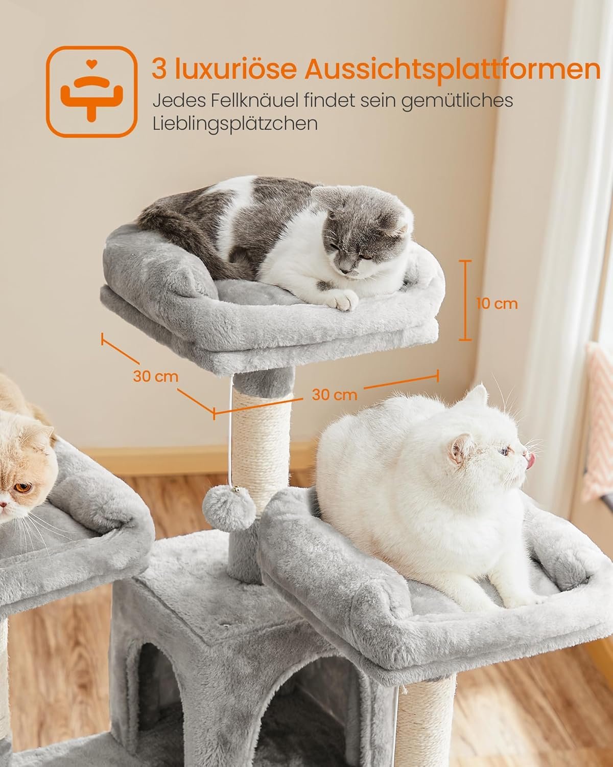 Kletterparadies: 3 große Aussichtsplattformen, 2 Häuser, 1 Liege, 3 Plüschbälle… wow, so viele Elemente! Dieser Kratzbaum ist ein wahres Paradies, das Katzen das ganze Jahr über ein spannendes Unterhaltungsprogramm bietet