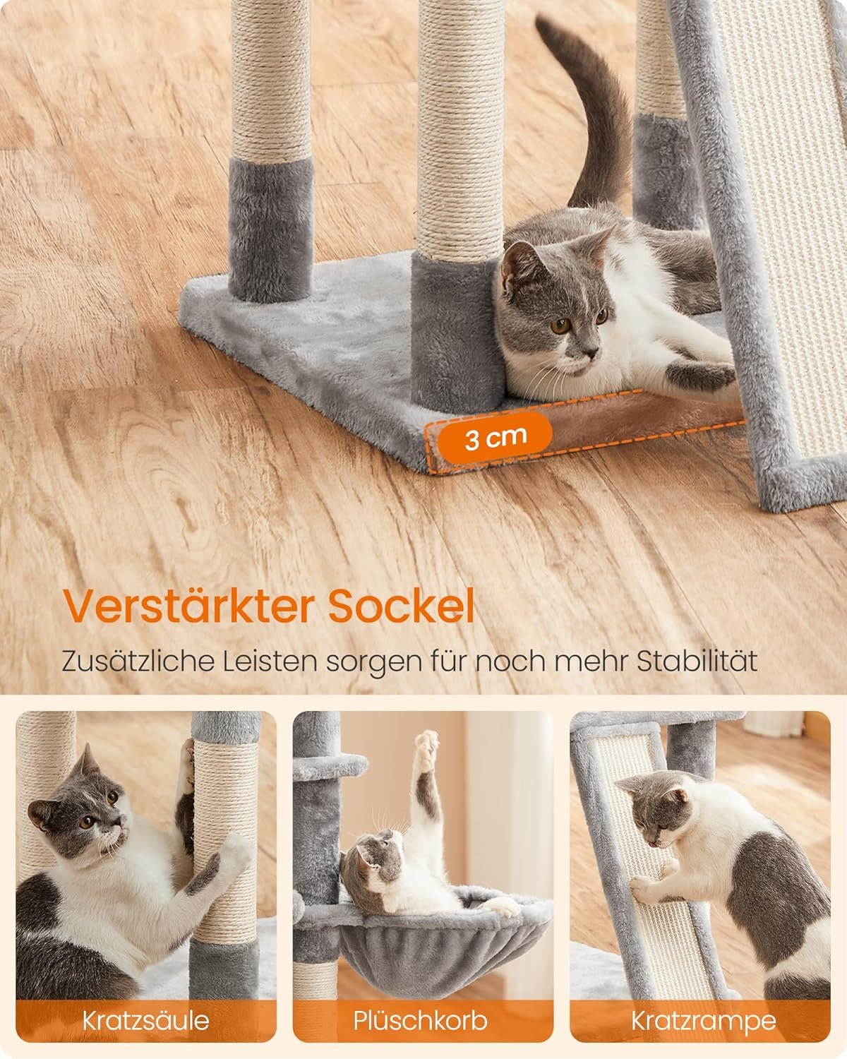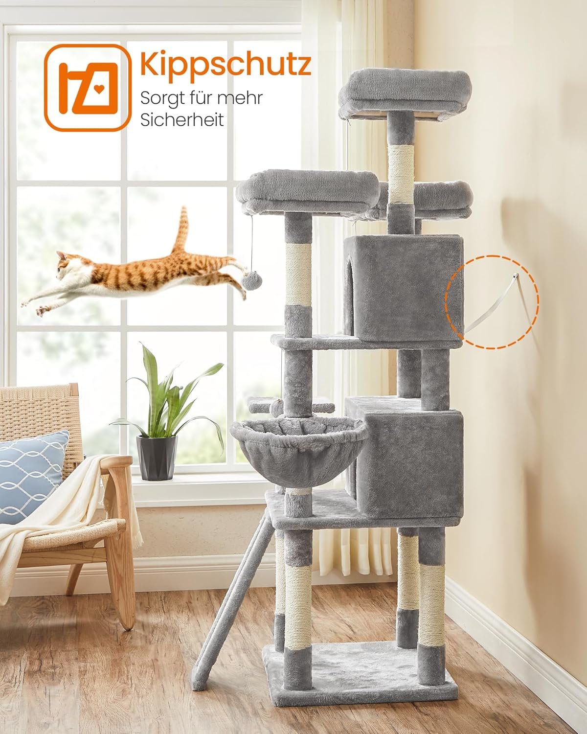 Sicher ist sicher: Toben Ihre Katzen gerne wild? Geh einfach weg! Dieser Kratzbaum ist mit einem robusten Standfuß und einem Kippschutz ausgestattet, sodass er stets für Stabilität sorgt, auch wenn 3 Katzen darauf herumspringen