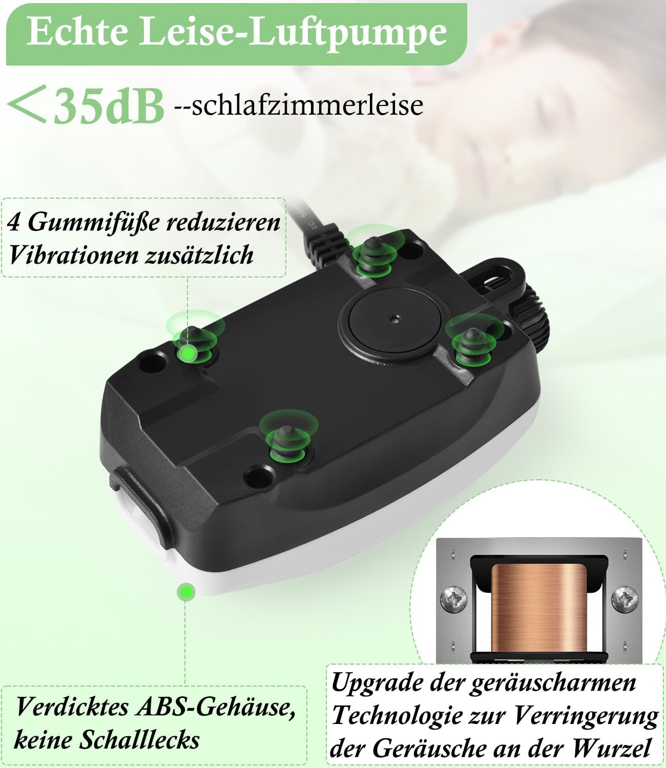 Flüsterleise Aquarium-Luftpumpe: Verbesserte Innenstruktur zur Reduzierung von Geräuschen von der Wurzel, und verdickte ABS-Schale kann die Innengeräusche der Pumpe stark absorbieren, 4 Gummifüße können Vibrationen der laufenden Luftpumpe stark dämpfen, so dass diese Luftpumpe wirklich leise ist, nur das Geräusch von Luftblasen ist zu hören.