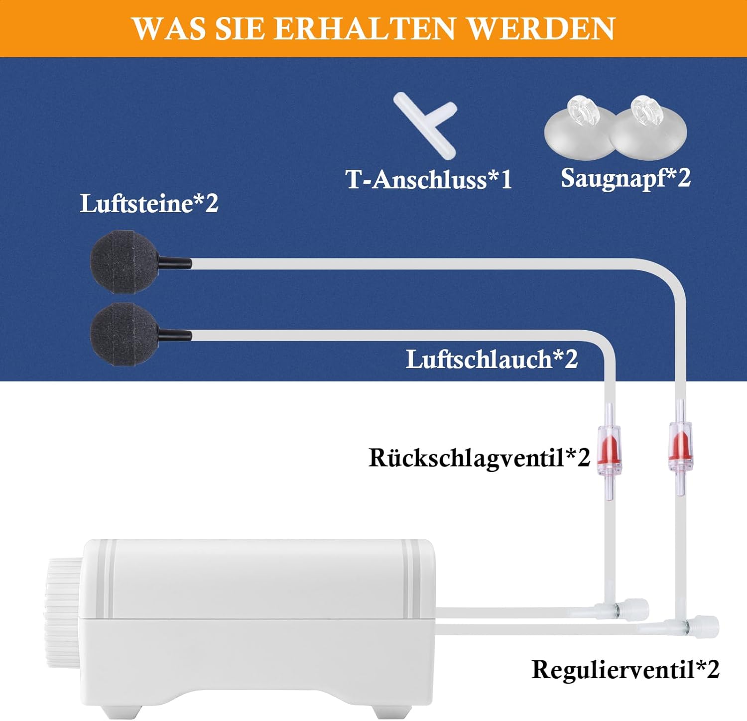 [All Accessories] Kommt mit allem notwendigen Luftpumpenzubehör, inklusive: Luftschlauch (1,5 m) x 2, Ausströmerstein x 2, Rückschlagventil x 2, Saugnapf x 2, Regulierventil x 2, T-Anschluss x 1. Wir bieten eine 24-monatige Garantie für diese Luftpumpe, bei Fragen können Sie sich gerne an uns wenden, unser After-Sales-Team wird Ihnen innerhalb von 24 Stunden antworten.