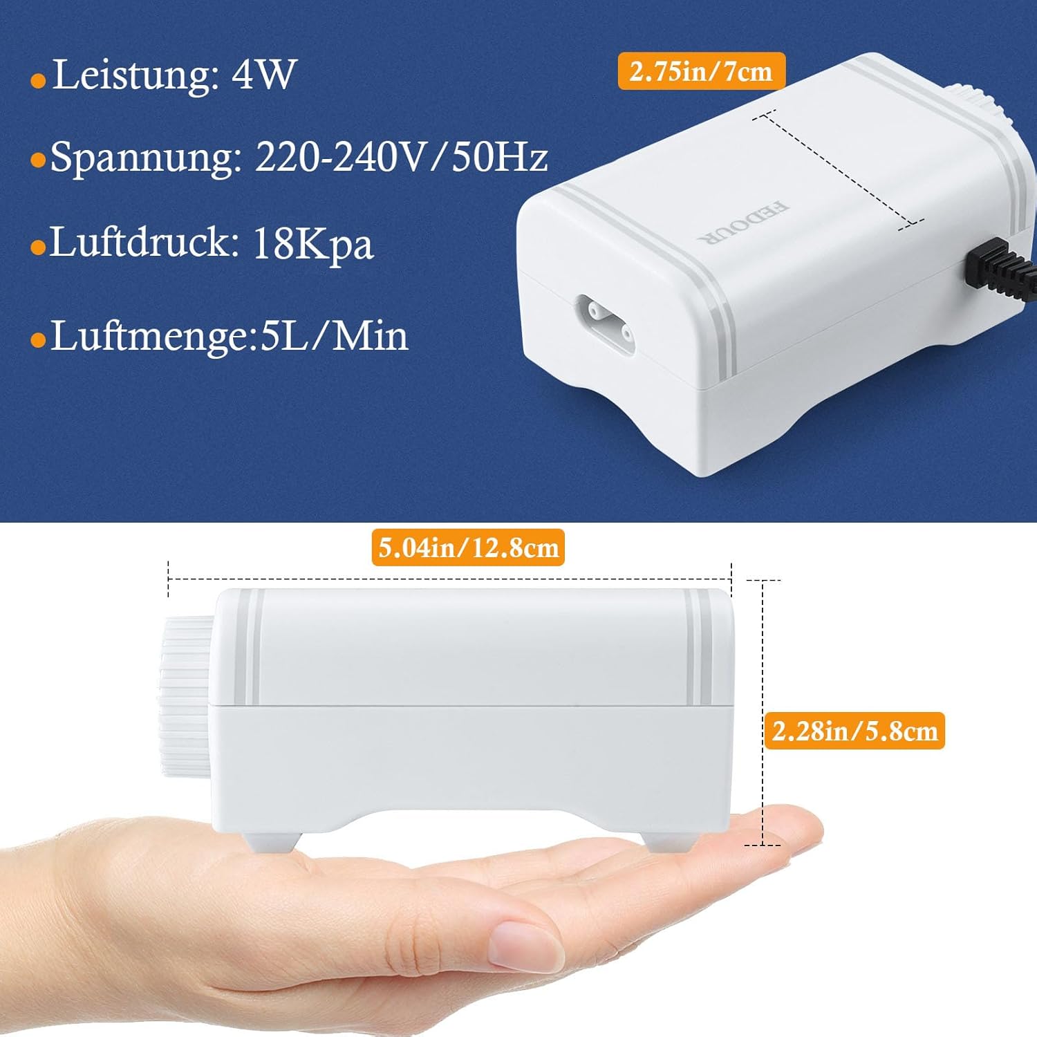 [Specifications] Leise Aquarium-Luftpumpe von FEDOUR, Leistung: 4 W, Spannung: 220–240 V/50 Hz, Druck: 18 kPa, Luftvolumen: 300 l/h, Größe: 12,8 x 7 x 5,8 cm. Geeignet für 1–350 l Fisch- und Schildkrötenbecken.