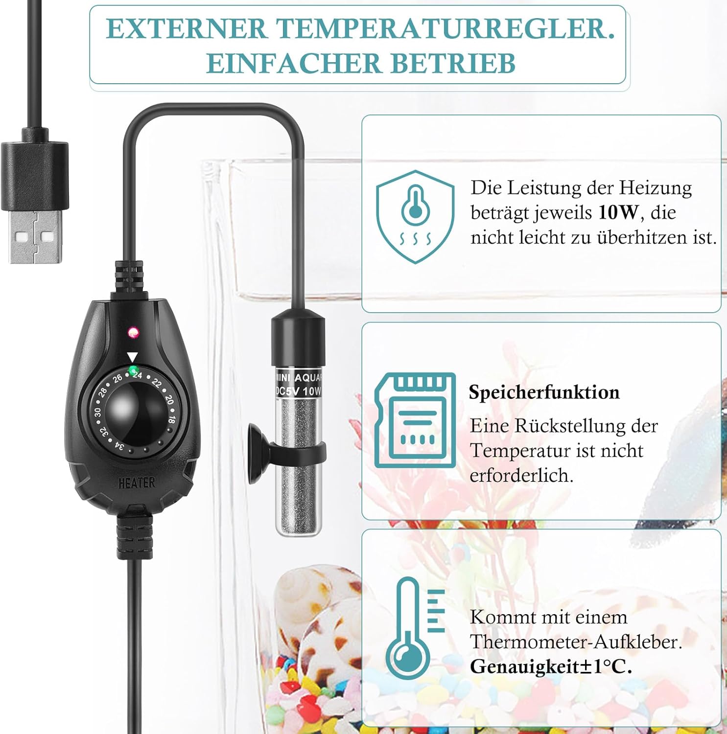 Dieser fingerdicke Heizer ist so klein, dass er problemlos in einem Aquarium versteckt werden kann. Dieser Heizer ist für Aquarien unter 10 Litern geeignet