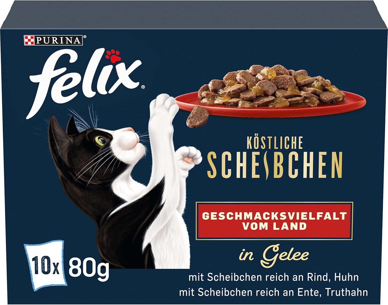 FELIX Köstliche Scheiben Nassfutter für ausgewachsene Katzen: Das unwiderstehliche Katzenfutter in Gelee mit einzigartigen Scheiben sorgt für eine willkommene Abwechslung im Futternapf. Die Katzenfuttermischung enthält verschiedene Sorten, sodass für jeden Geschmack etwas dabei ist. Vitamin D & E sowie Omega-6-Fettsäuren im Nassfutter unterstützen ein zufriedenes Katzenleben voller Energie und Abenteuer. Unser hochwertiges Nassfutter ist zudem 100 % vollwertig und ausgewogen. Die perfekt dampfgegarten Scheiben bieten Ihrer Katze ein einzigartiges Geschmackserlebnis. Mit einem hohen Proteingehalt und einem unwiderstehlich leckeren Gelee sind diese Mahlzeiten ein wahrer Genuss für Ihre Katze. Jede einzelne Scheibe wird sorgfältig zubereitet, um das volle Potenzial der hochwertigen Zutaten auszuschöpfen und ihren leckeren Geschmack zu entfalten. Felix leckere Scheiben – ausgewogenes Alleinfutter für ausgewachsene Katzen – leckere Scheiben in Gelee – Futter für Katzen mit Omega-6-Fettsäuren – hochwertiges Nassfutter für Katzen mit Vitamin A, Vitamin D3 und Vitamin E Felix – einfach unwiderstehlich