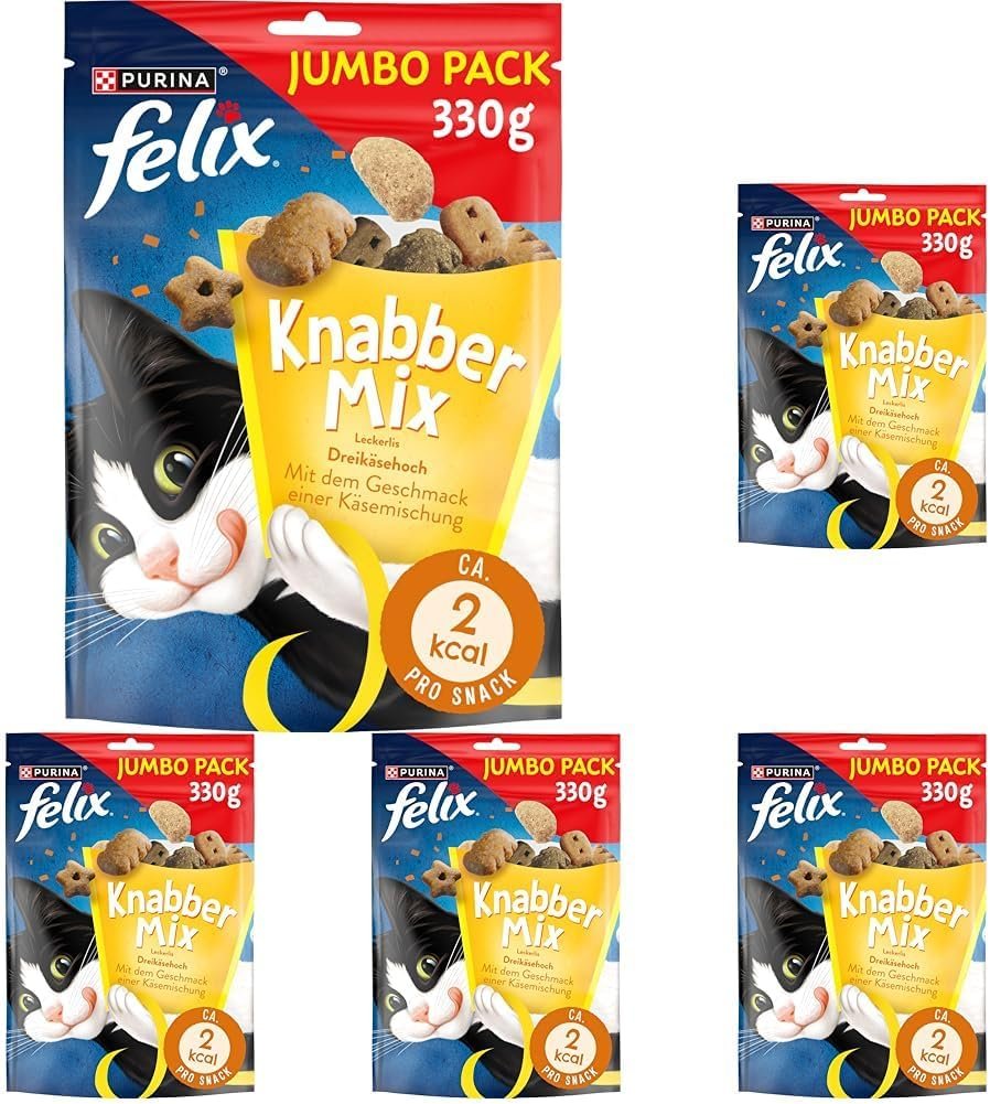 FELIX KnabberMix Katzenfutter Leckerbissen Original. Alles was das Racker-Herz begehrt! Selbst wenn Sie mit der Verpackung rascheln, macht Ihr schnurrender Begleiter Freudensprünge. Denn die kleinen Katzensnacks mit leckerem Huhn, Leber und Truthahn schmecken nicht nur verführerisch – sie sind auch unwiderstehlich lecker. Die Leckerlis enthalten viele wertvolle Proteine, Vitamine und Omega-6-Fettsäuren, die Ihrer Katze ein gesundes und glückliches Leben ermöglichen. Praktisch ist auch die wiederverschließbare Verpackung, denn so bleiben die Snacks frisch und verwöhnen Ihren Racker täglich. Felix – wirklich clever! Das Produkt weist folgende Eigenschaften auf: Futterart: Ergänzungsfutter, Alter: erwachsene Katzen, Geschmacksrichtung: Huhn, Leber, Truthahn, nur ca. 2 kcal pro Stück – Inhalt: Maxi-Packung 1 x 200 g Beutel Felix Leckerli Fütterungsempfehlung: Die tägliche Futtermenge von Felix KnabberMix für eine normale ausgewachsene Katze (4 kg) beträgt bis zu 13 g oder ca. 35 Stück. Bitte reduzieren Sie die Hauptmahlzeit entsprechend und versorgen Sie Ihre Katze mit frischem Trinkwasser. Beim Füttern sollte Ihre Katze stets unter Beobachtung stehen.