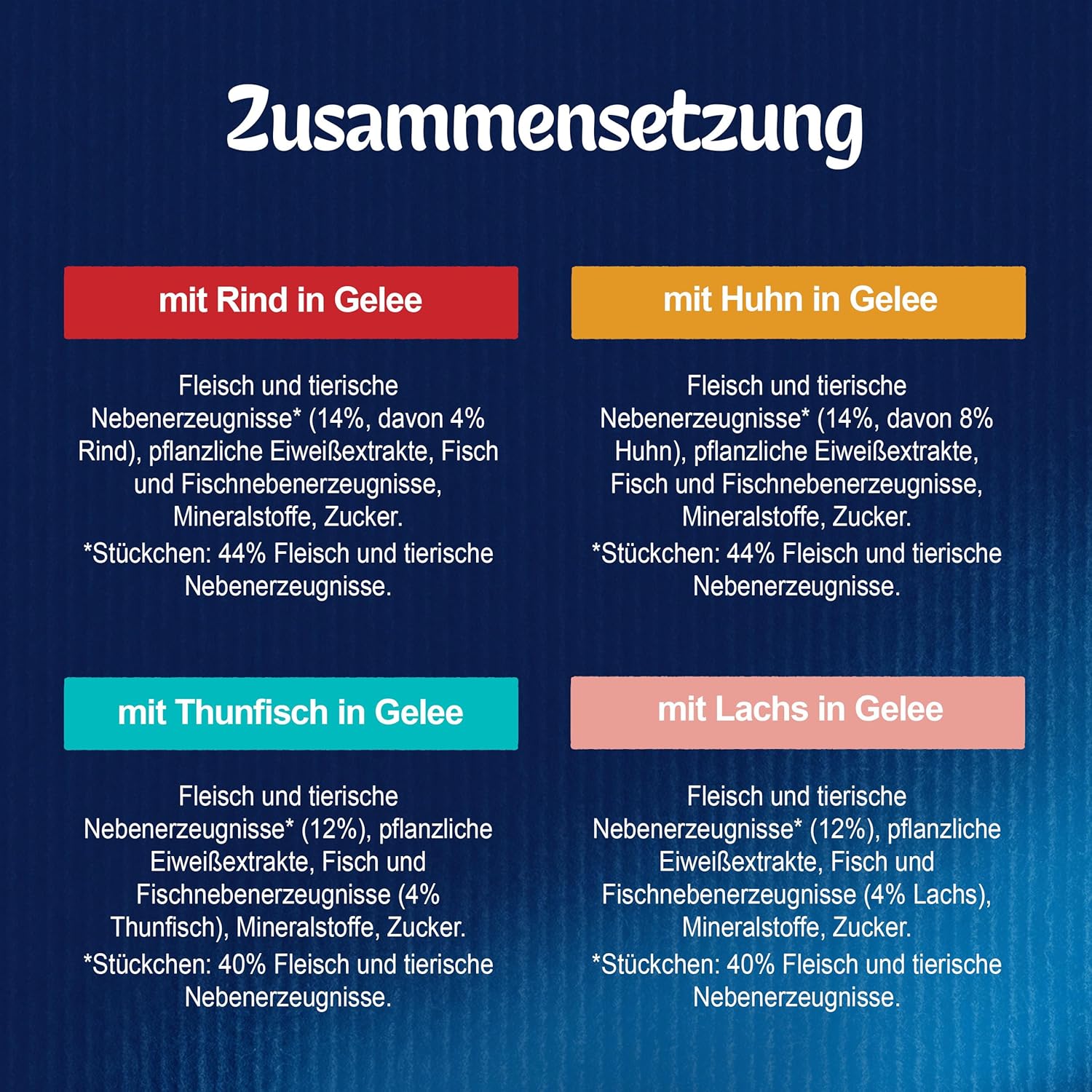 Katzenfuttermischung mit zarten Stücken in den Sorten Rind, Huhn, Thunfisch, Lachs