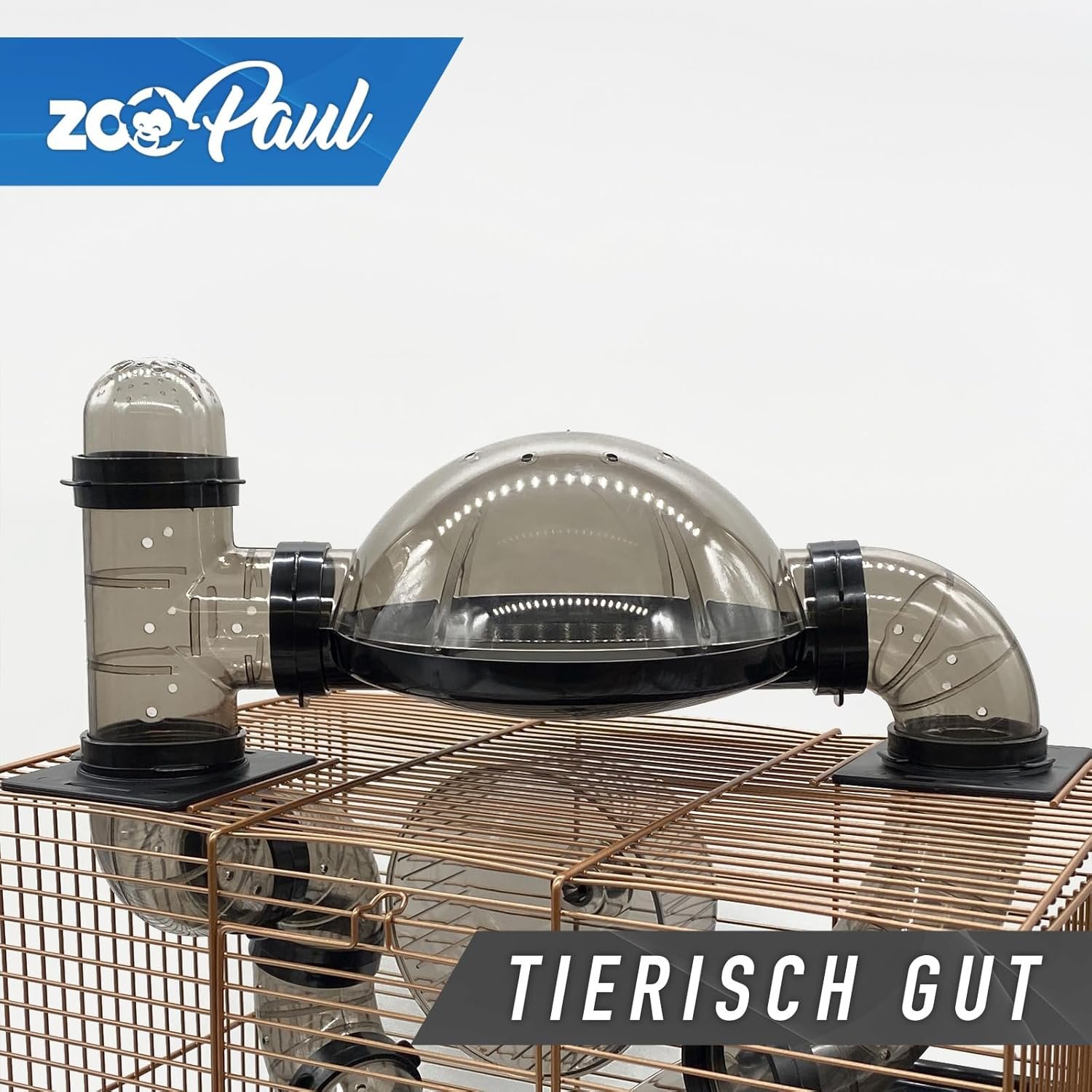 Vielfältige Ausstattung: mehrere Ebenen mit transparentem Rohrsystem und Rampe für Spiel, Bewegung und Rückzug