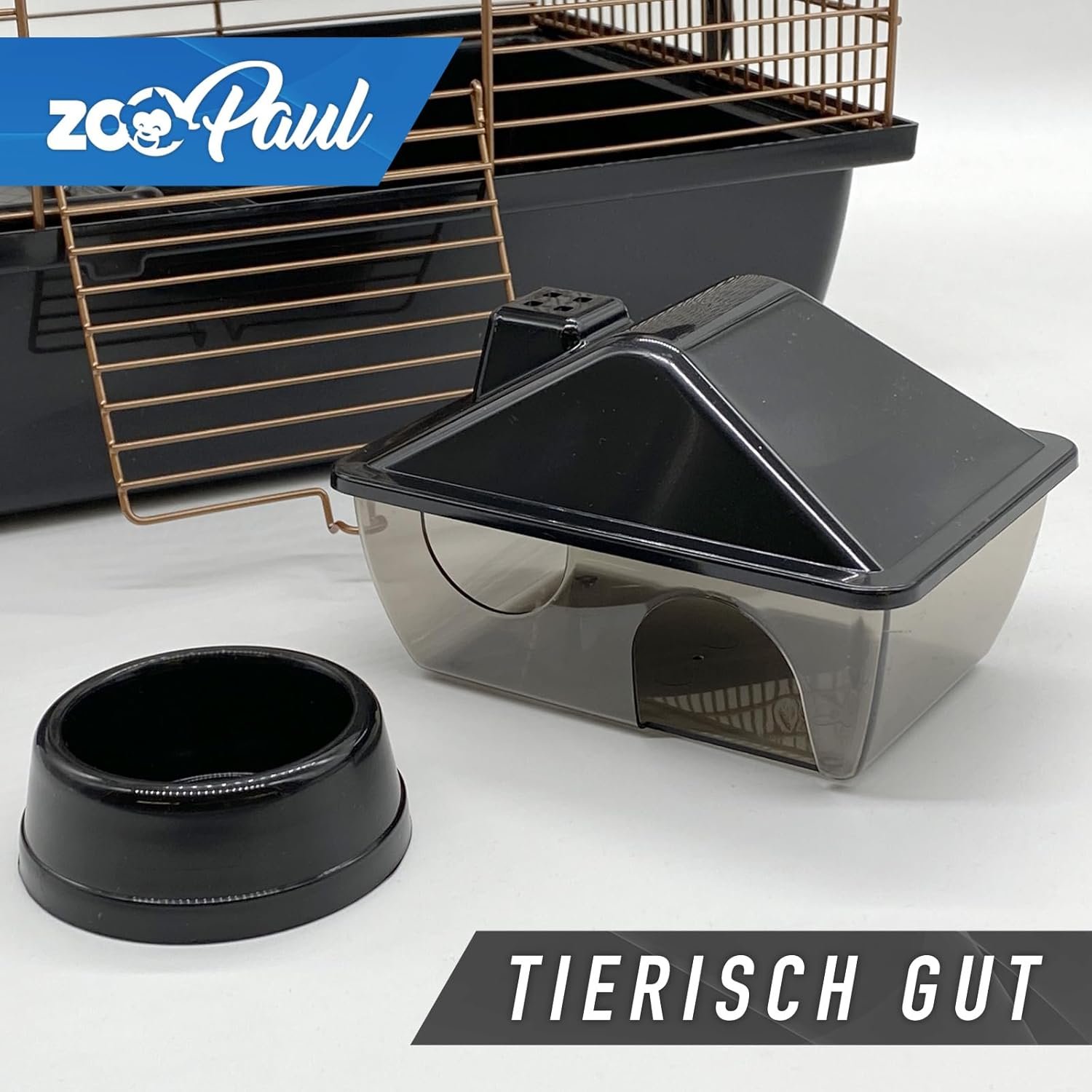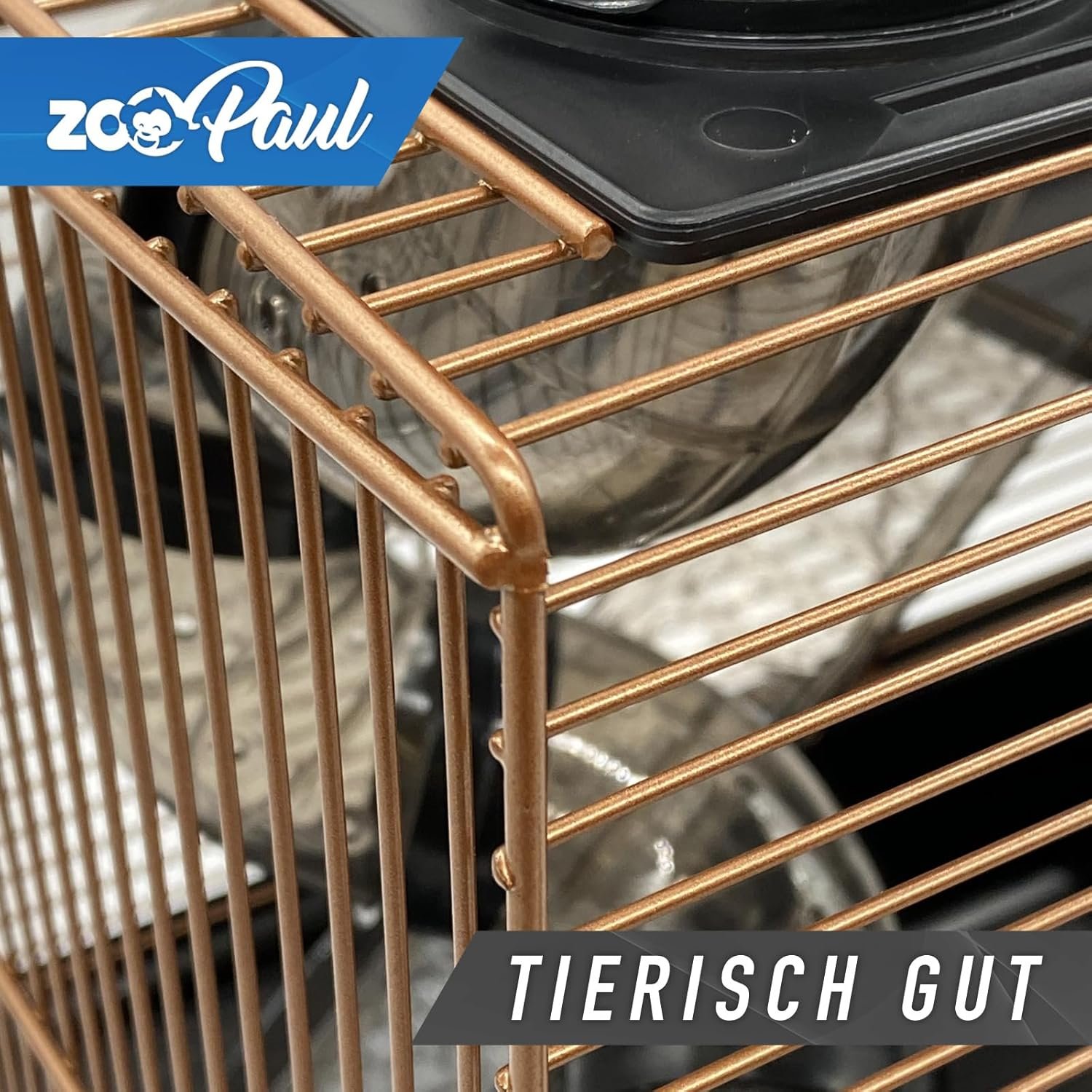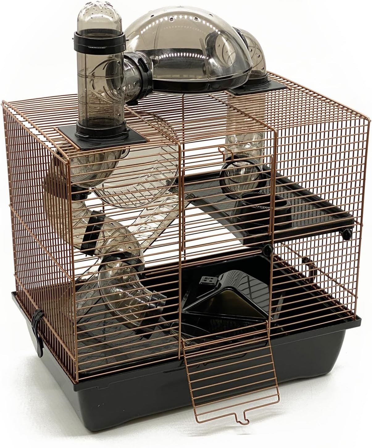 Der Hamsterkäfig Rocky vereint funktionelles Tierzubehör mit modernem Industriedesign. Die Kombination aus kupferfarbenem Metallgeflecht, schwarzen Kunststoffelementen und transparenten Rohrsystemen macht es zu einem echten Hingucker – perfekt für stilvolle, minimalistische Wohnräume.