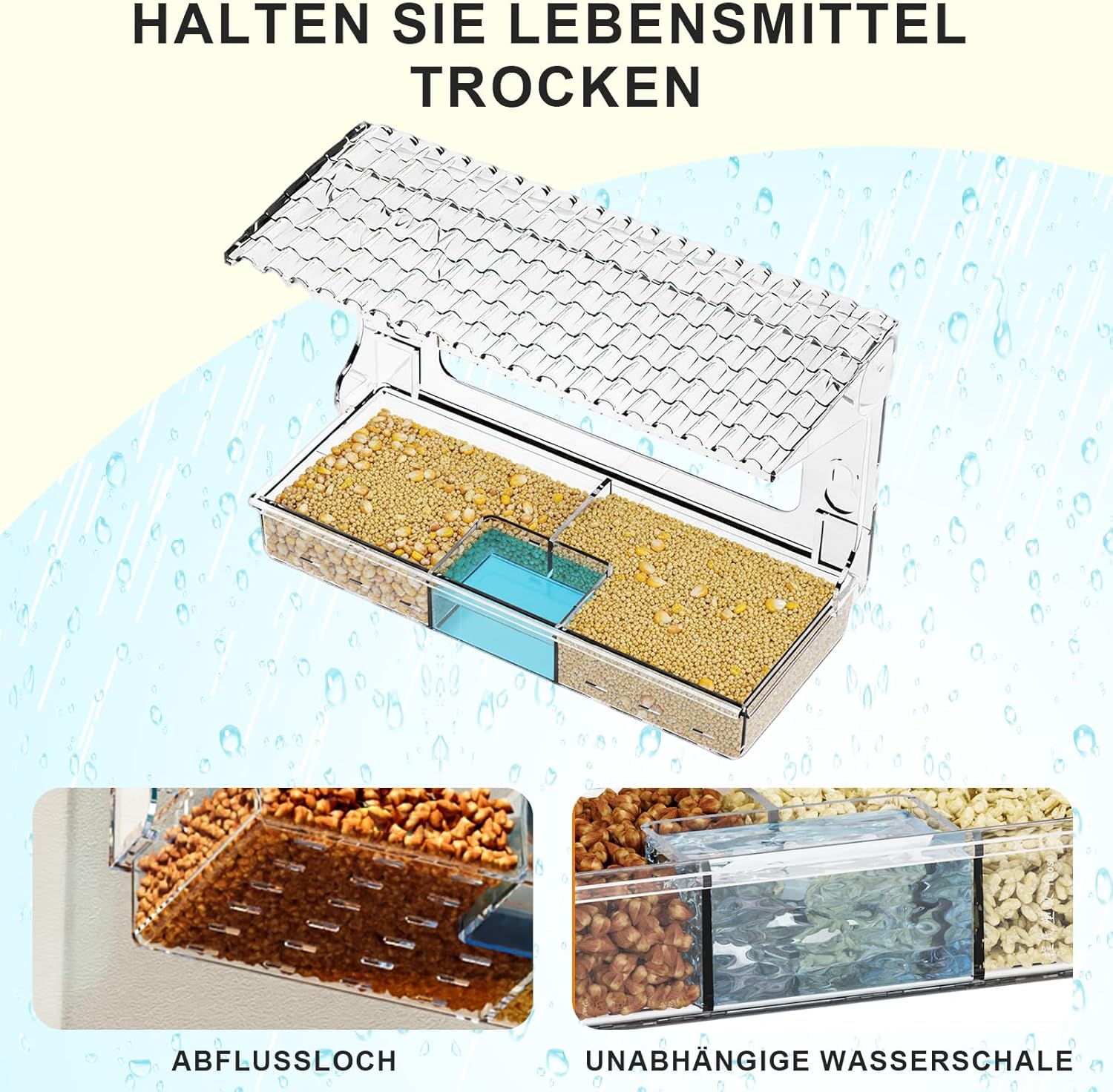 Entwässerungssystem: Das Vogelfutterhaus verfügt über ein cleveres Entwässerungsdesign, das Staunässe verhindert. Ideal für Samen, Früchte und Wasser – hält Ihr Vogelfutter trocken und schimmelfrei. Drei separate Fächer ermöglichen die Aufbewahrung verschiedener Arten von Futter, um verschiedene Vogelarten anzulocken. Ein Vogelhäuschen mit praktischer Funktionalität
