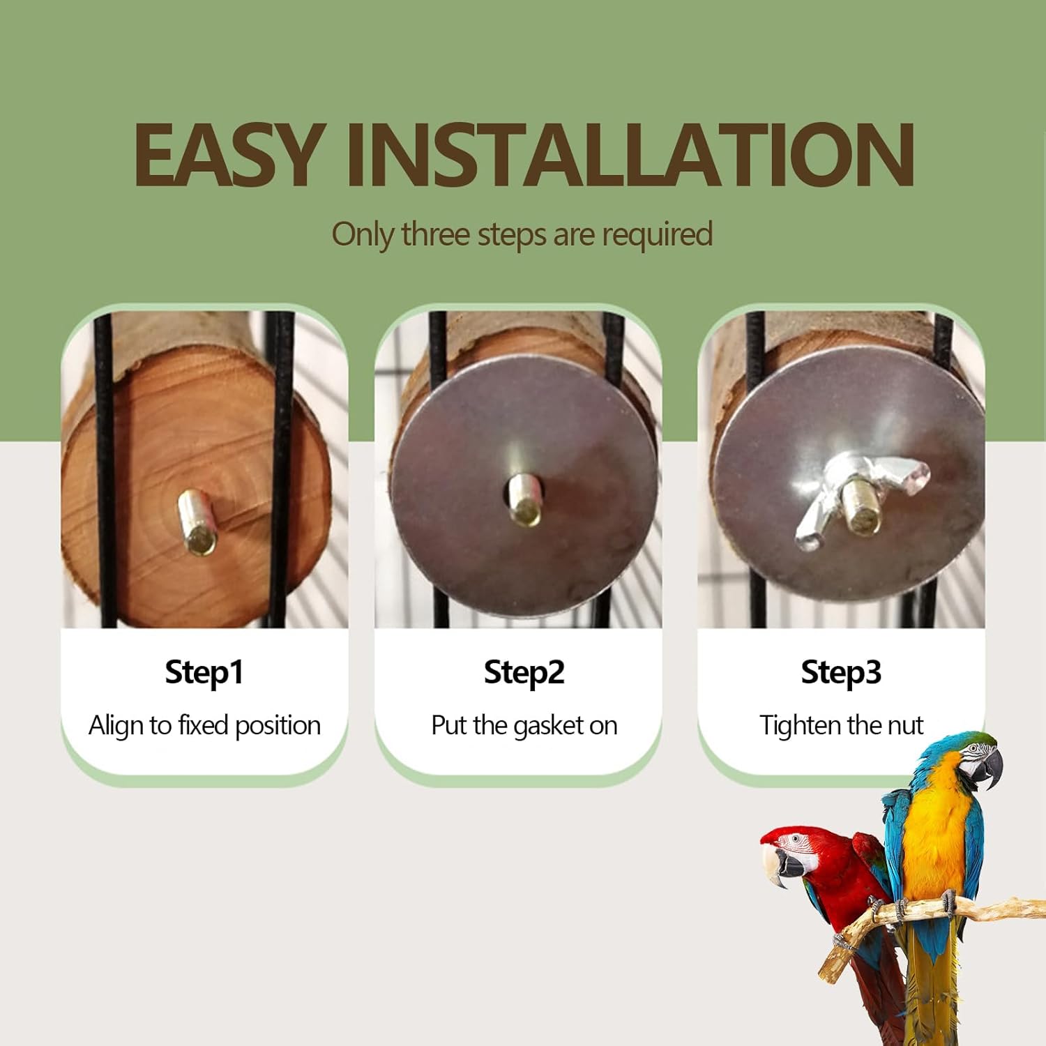 2. Der Aufbau der Sitzstangen für Vogelkäfige ist ein Kinderspiel. Befestigen Sie einfach zwei Metallscheiben am Vogelkäfig und ziehen Sie die Muttern fest. Die einfache Montage erleichtert die Verwendung und den Austausch der Vogelsitzstange.