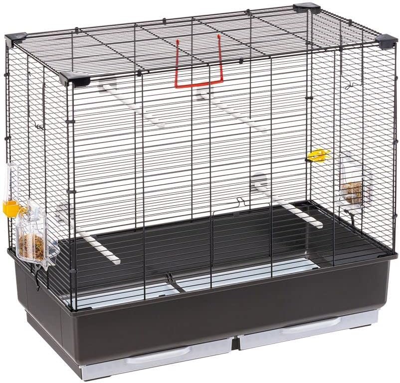 Großer Käfig für Kanarienvögel, Sittiche und andere Kleinvögel, der zahlreiche Vorteile bietet: solide und elegante Konstruktion, der Käfig ist komplett zerlegbar und im zusammengebauten Zustand mit einem Oberrahmen und vier Kunststoffsäulen in den Ecken besonders elegant und leicht zu reinigen