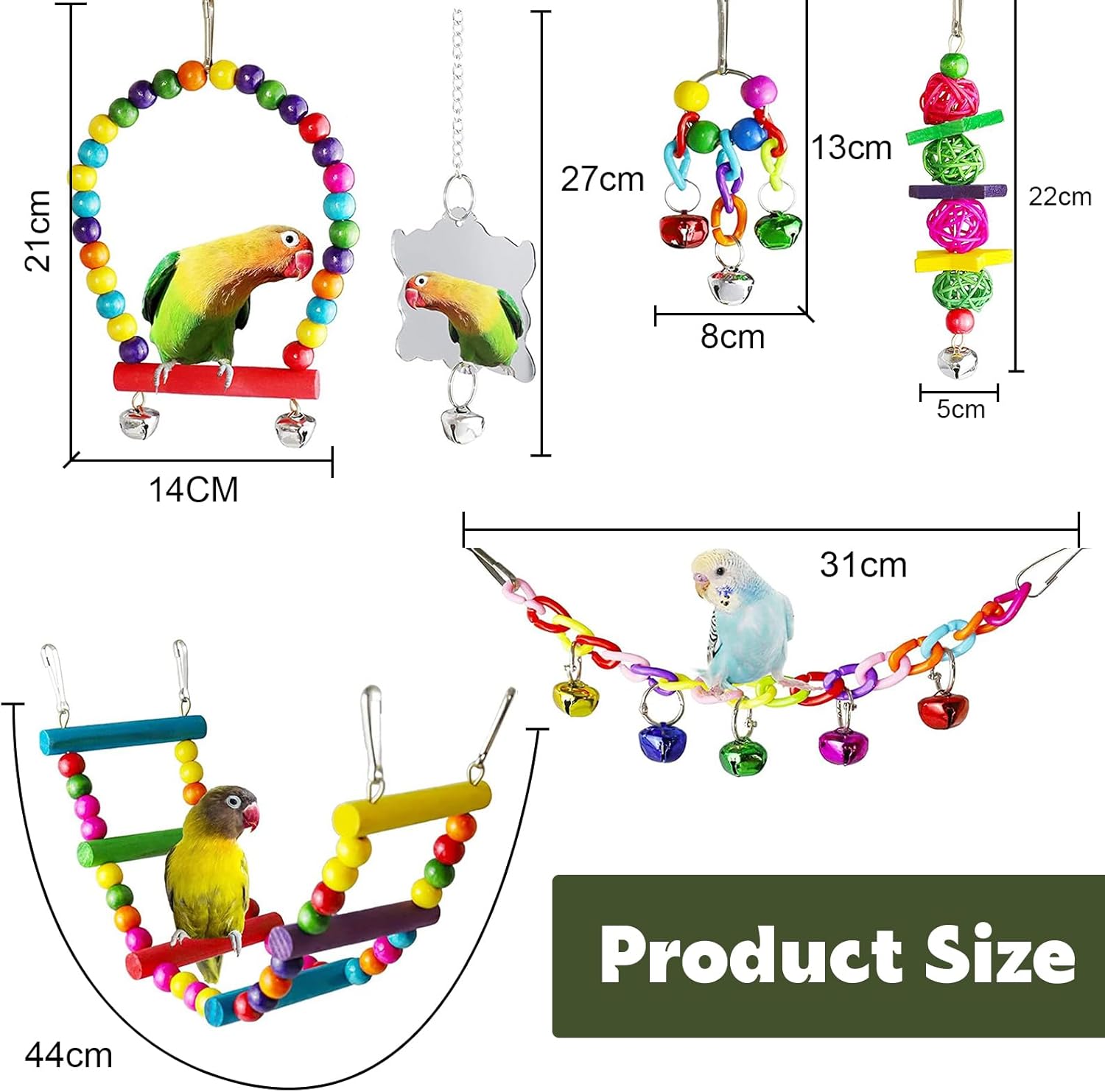 7-teiliges Vogelspielzeug: Das Set enthält 1 x Kauspielzeug, 1 x Drehleiter, 2 x Glockenspielzeug, 2 x Schaukelspielzeug für Vögel, 1 x Spiegel. Eine Vielzahl von Spielzeugen, um den Spielbedürfnissen von Papageien gerecht zu werden.