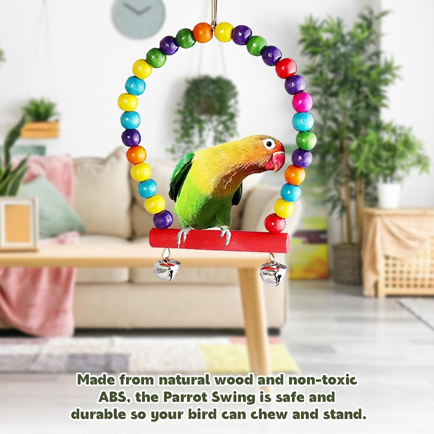 Einzigartiges Design: Das Holzmaterial ist sicher für Vögel. Die Metallglocke gibt einen klaren Ton von sich, wenn der Vogel fliegt und klettert. Die raue Oberfläche des Sitzstangenständers ermöglicht es Papageien, ihre Krallen zu schärfen.