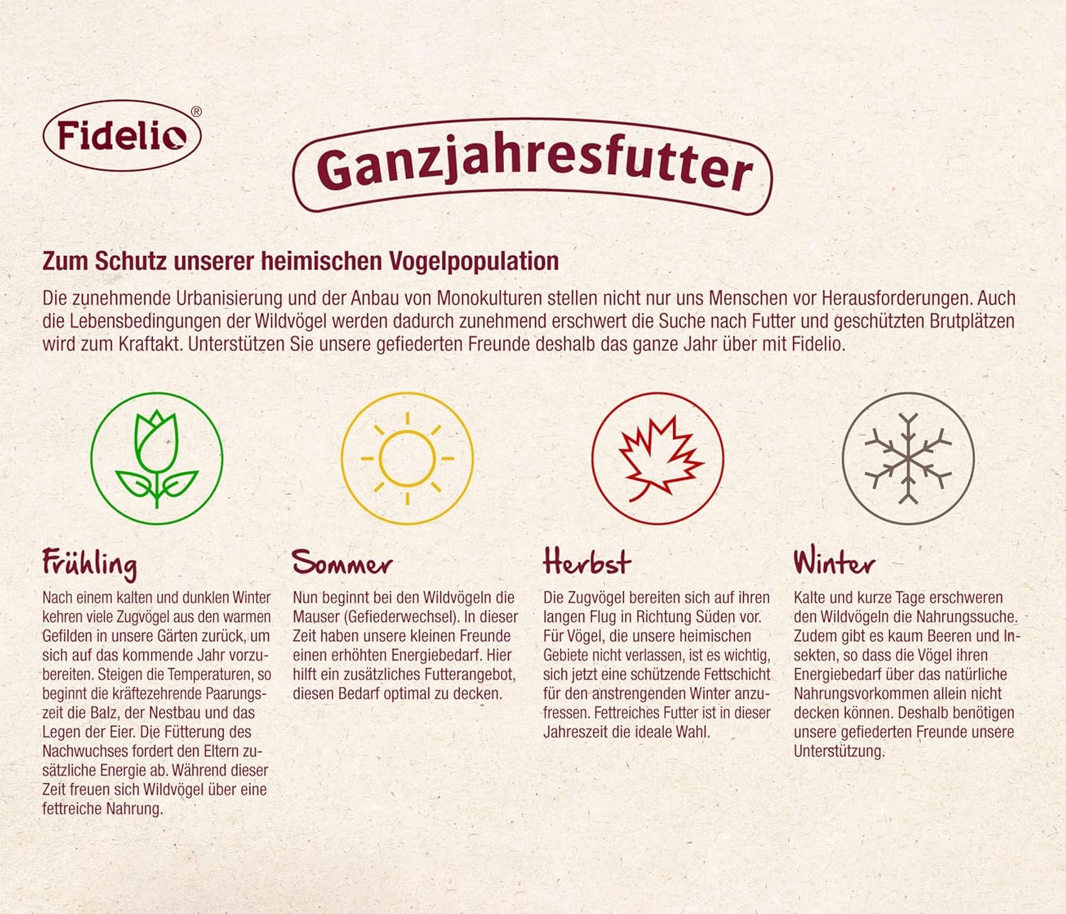Unser Ganzjahresfutter ist die optimale Nahrungsergänzung für Wildvögel, da es zu allen Jahreszeiten auf deren spezielle Bedürfnisse abgestimmt ist. Reichhaltige Nährstoffe unterstützen das Immunsystem und die Vitalität der Vögel. So sind sie bestens auf alle Widrigkeiten vorbereitet. Fidelio Ganzjahreskost zu jeder Jahreszeit.