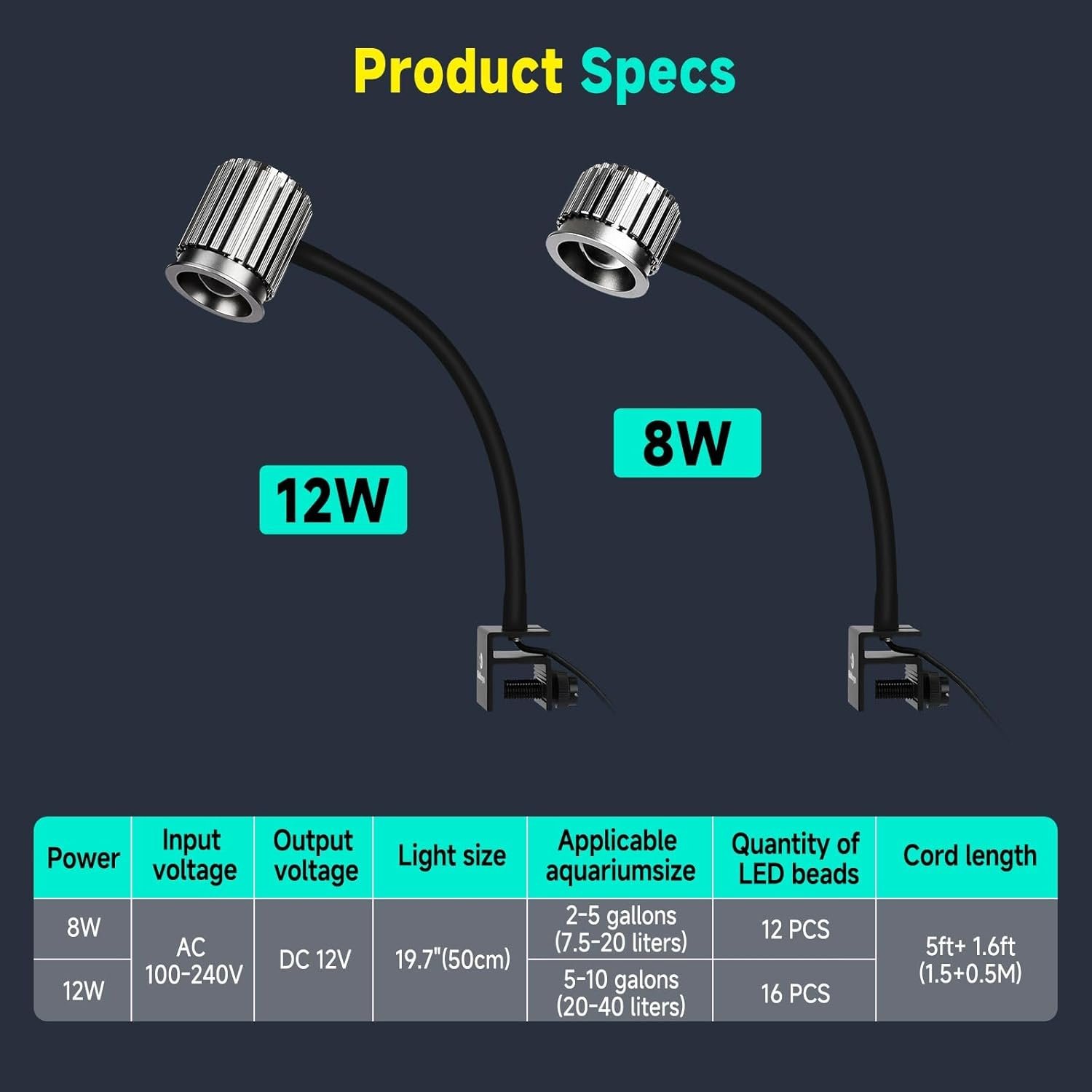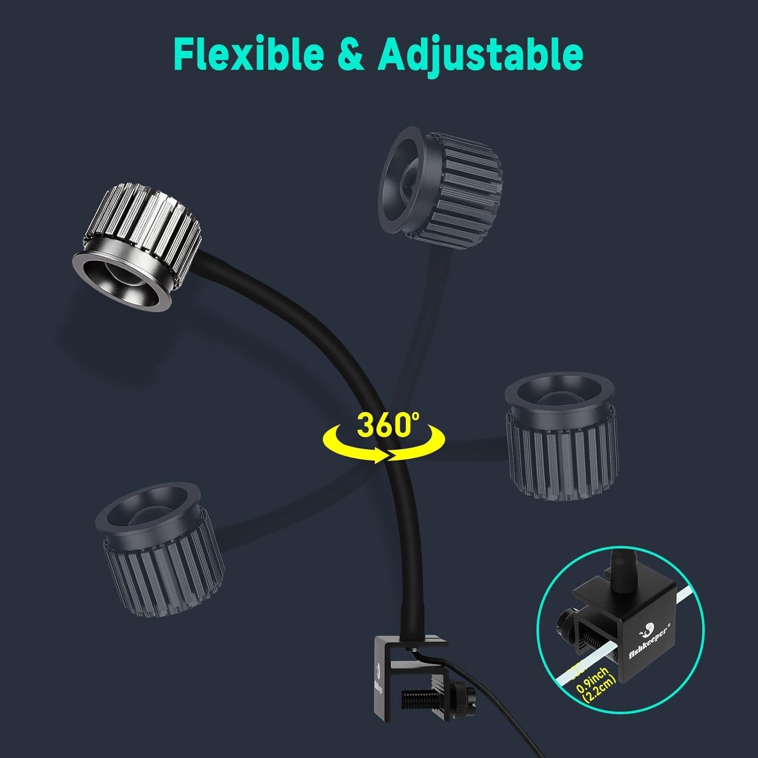 60°-Optiklinse und verstellbarer Schwanenhals: Im Gegensatz zu gewöhnlichen flachen Linsen auf dem Markt erhöht unsere konvexe Linse die Lichtdurchdringung und ermöglicht, dass das Licht die Tiefe des Aquariums besser erreicht. Der 360° flexible Schwanenhals aus Aluminium lenkt das Licht präzise, und die Halterung passt auf Glas bis zu 7/8 Zoll – gemacht für Ihr Salzwasseraquarium-Komplettset.