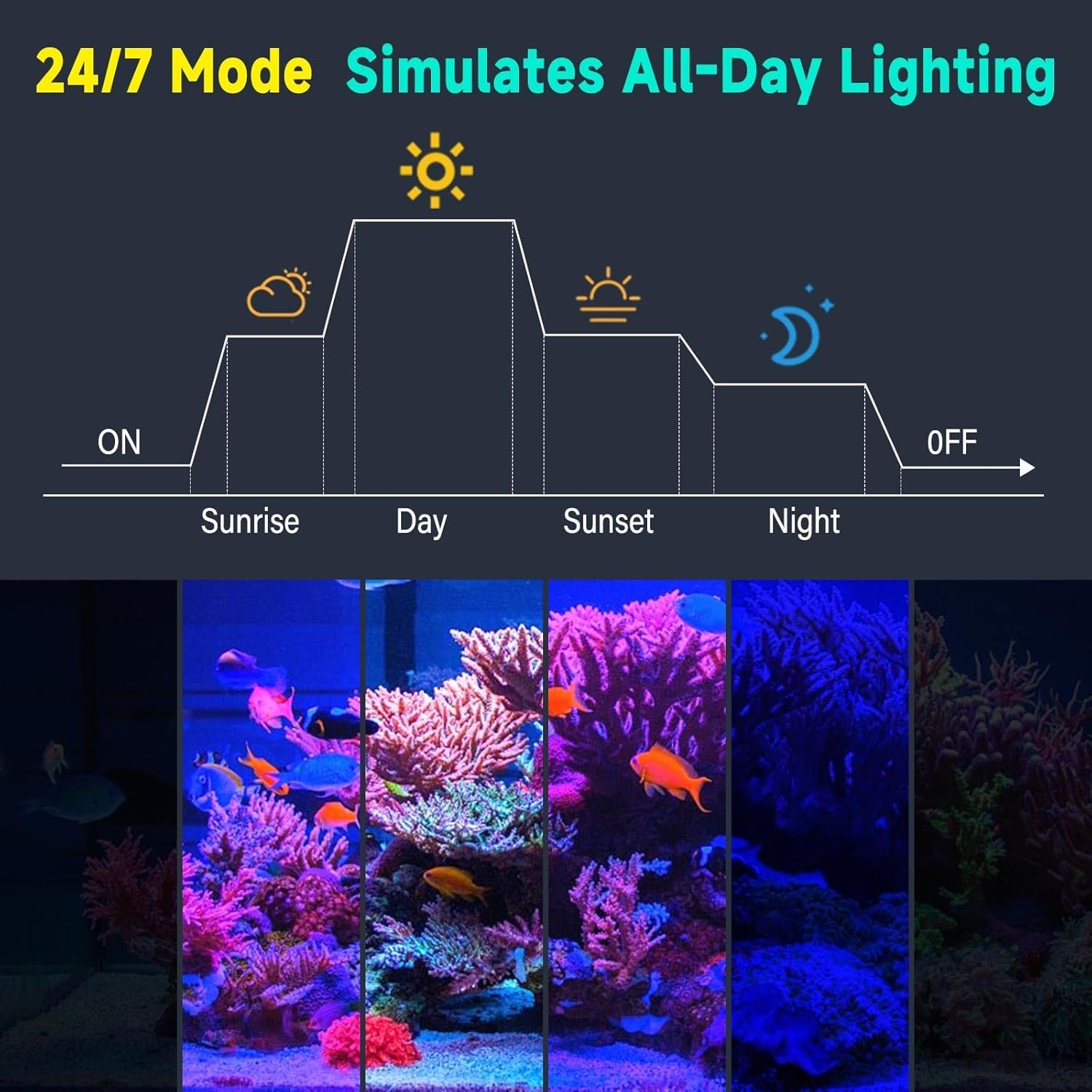 Natürlicher 24/7-Modus: Der voreingestellte 24/7-Modus simuliert natürliches Licht unter dem Meer. Sie können das 24/7-Programm jederzeit zu 6 festgelegten Zeiten entsprechend der Ortszeit mit einem Klick starten. Der Modus simuliert das Licht natürlich entsprechend der Ortszeit und wiederholt sich täglich im Zyklus. Perfekt für die Korallen- und Fischgesundheit im Meerwasseraquarium.