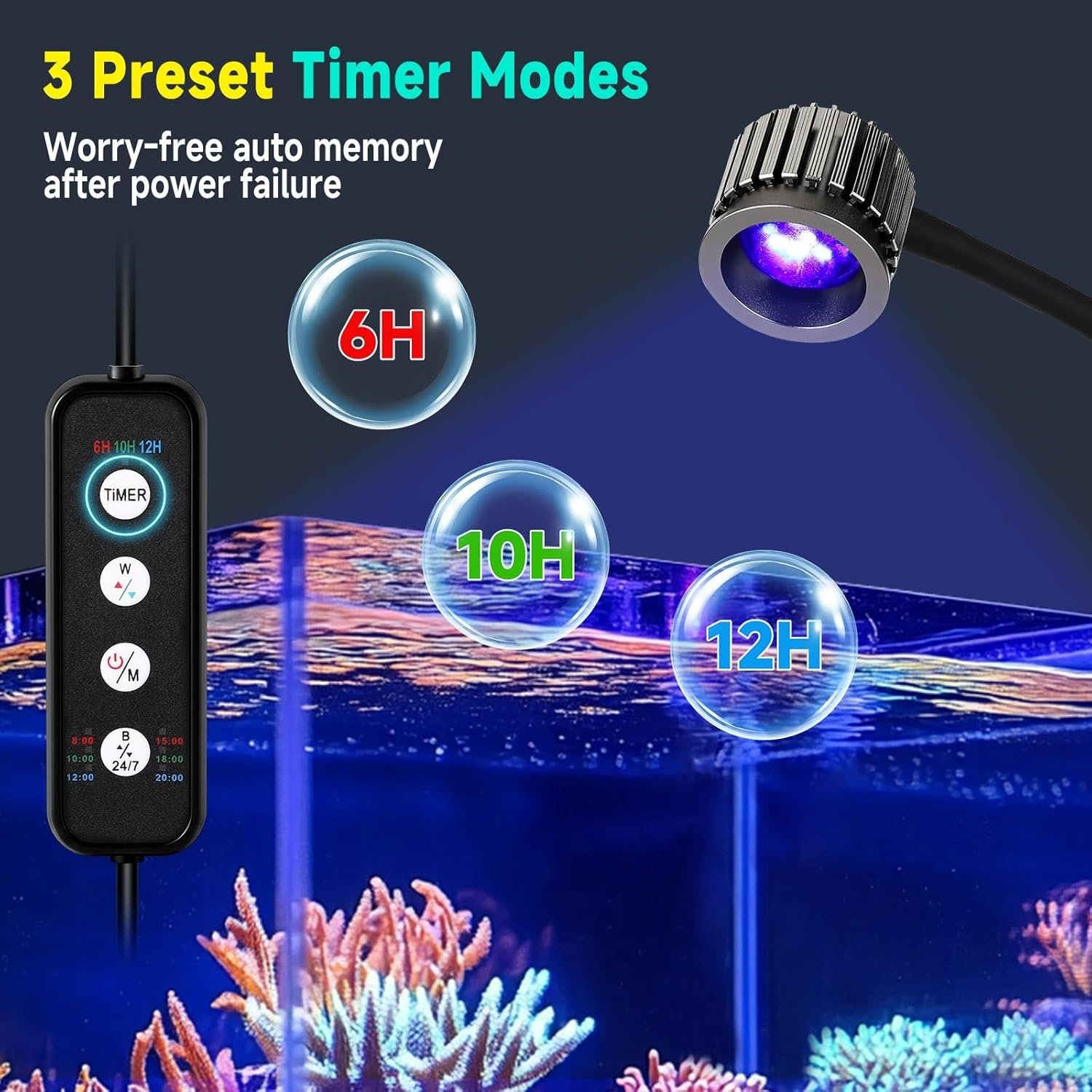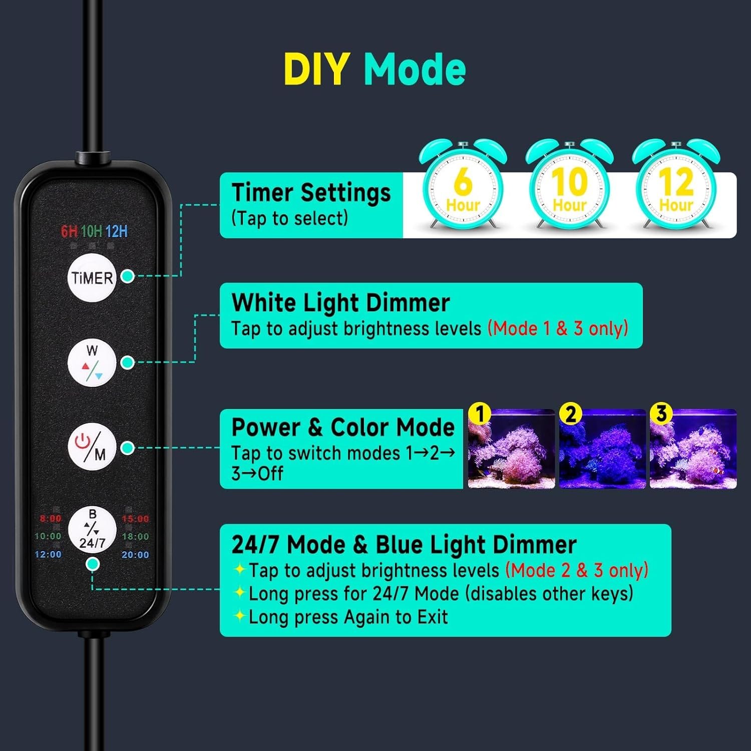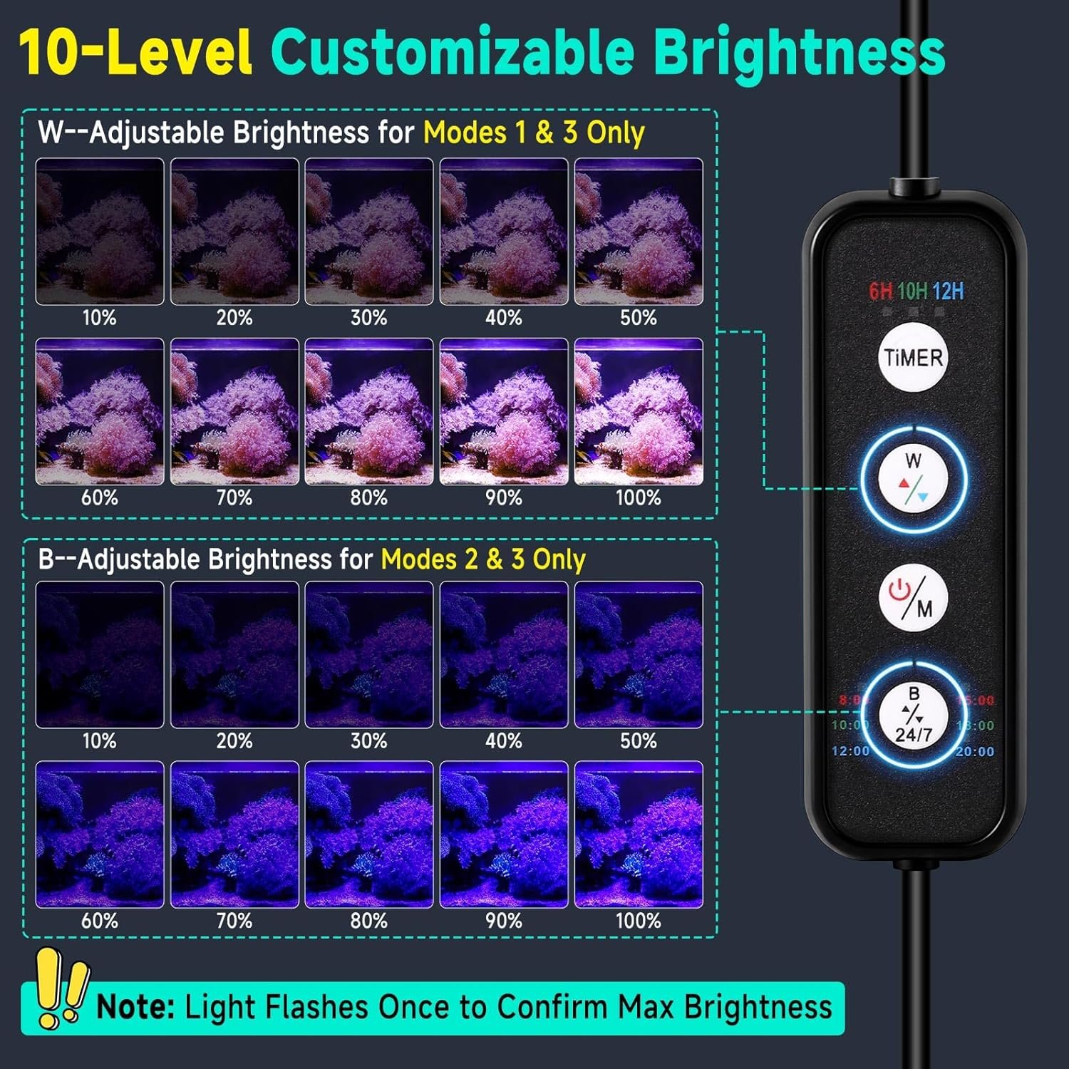 3 DIY-Farben + 10 Helligkeitsstufen + 3 Timer-Modi: Diese Meerwasser-LED-Aquarienlampe bietet 3 verschiedene Blautöne (Hellblau, Königsblau, Blauviolett). Gleichzeitig bietet es 10 einstellbare Helligkeitsstufen (weißes und blaues Licht können unabhängig voneinander reguliert werden). Mit 3 Timer-Optionen (6/10/12 Stunden) startet das Aquarium-LED-Licht automatisch täglich mit Ihren gespeicherten Einstellungen – ideal für Korallen- und Meerwasseraquarien.