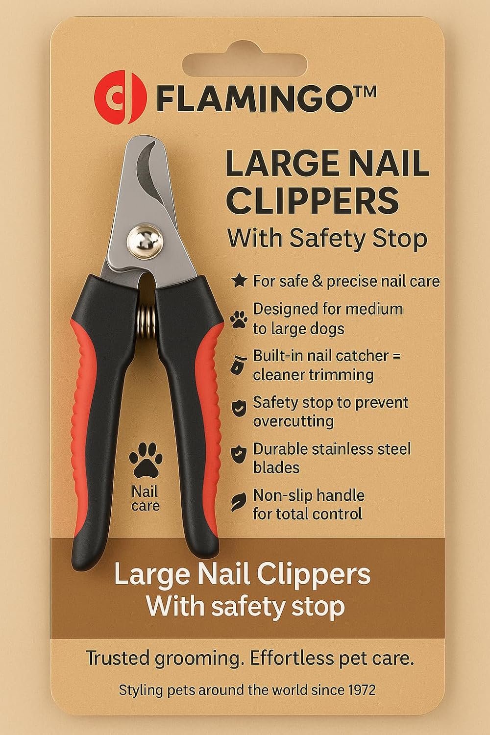 Geeignet für XL-Hunderassen – Ideal für große Hunderassen wie Labradore, Deutsche Schäferhunde, Rottweiler, Golden Retriever und andere große Hunde mit starken Krallen. 👉 Mit dem professionellen Flamingo Knippie Groß Krallenschneider halten Sie die Krallen Ihres Hundes sicher und pflegeleicht – ein unverzichtbares Werkzeug für jeden Hundebesitzer!