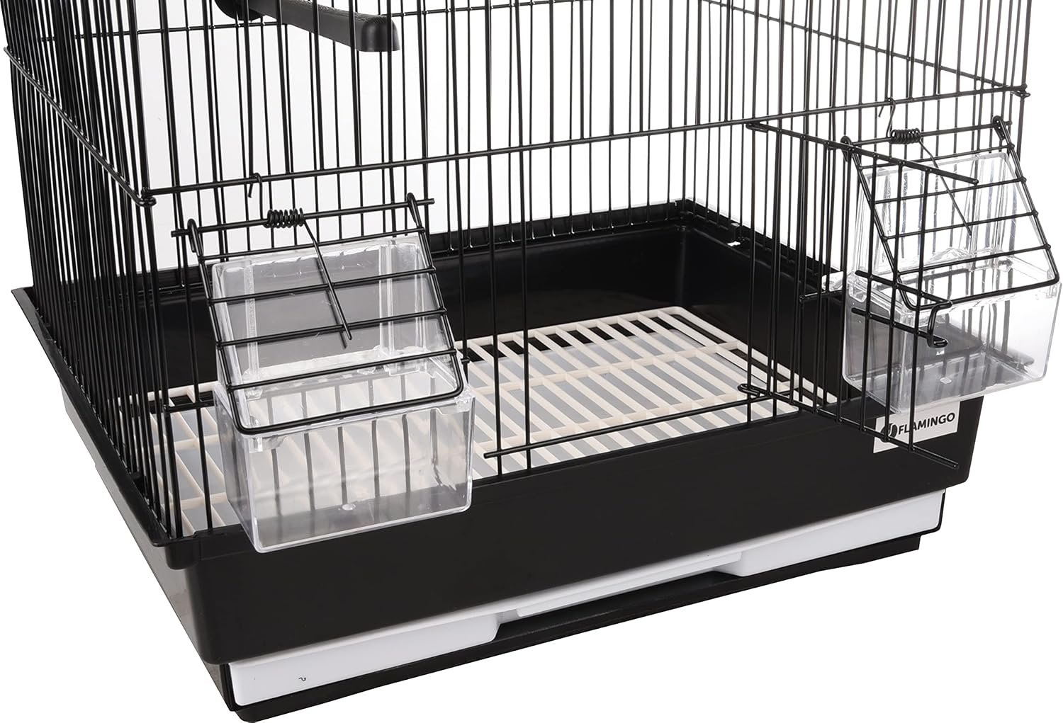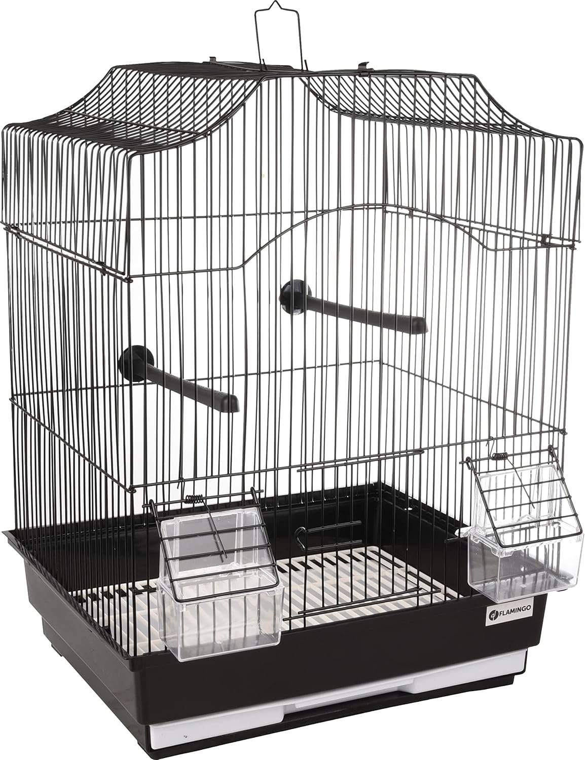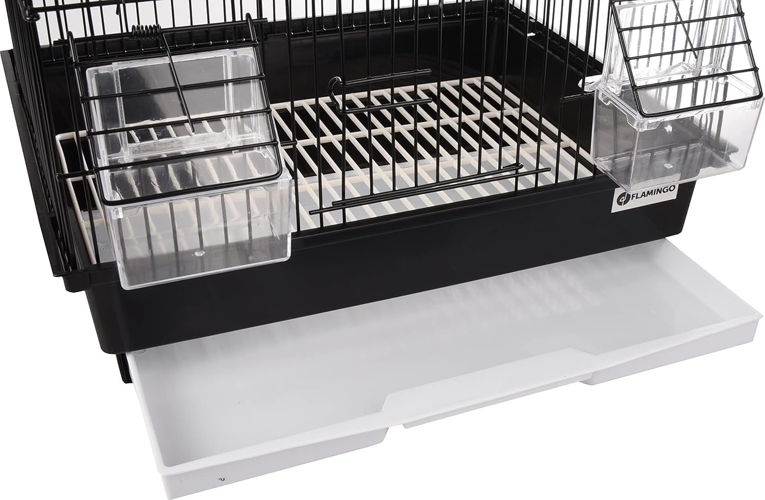 Der schwarze Vogelkäfig ist klein und praktisch, ideal für den Transport oder die Quarantäne. Trotz seiner kompakten Abmessungen bietet es allen nötigen Komfort.