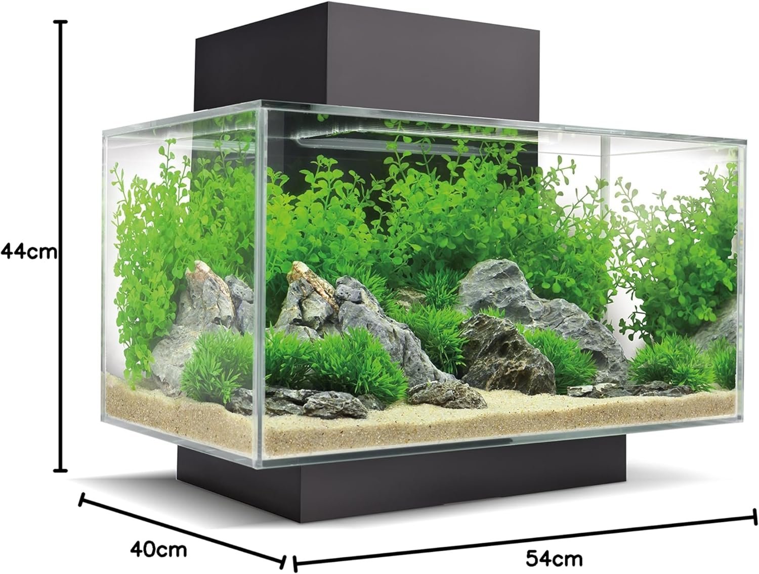 Technische Daten: Erhältlich in Schwarz und Weiß. Aquariumkapazität: 23 Liter. Leistung: 4,4 Watt. Lumen: 347 lm. Farbtemperatur: 6500 K. LEDs: 21. Pumpenleistung: 378 Liter pro Stunde. Größe: 43 x 36,8 x 26 cm