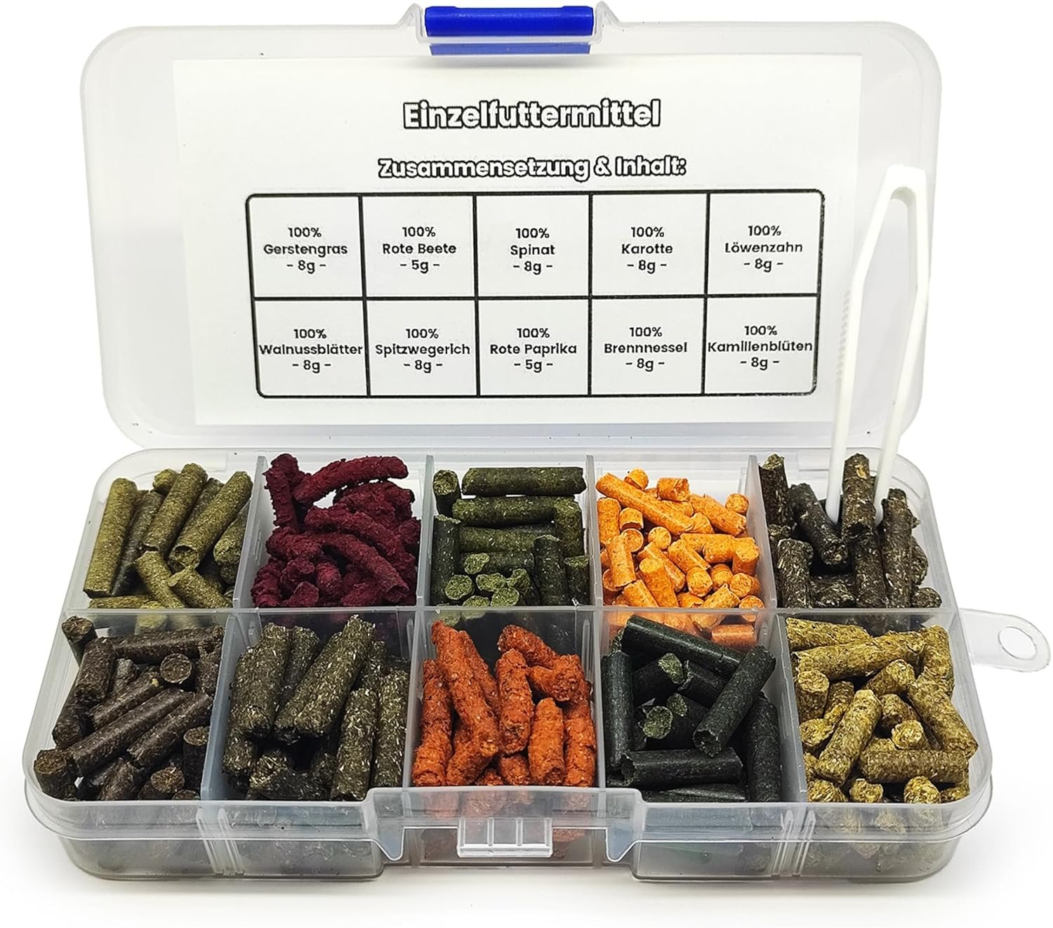 In diesem Food Sticks Probierset haben wir die Top 10 Sticks in einer Box verpackt. Ganze 74 g sind dabei entstanden. Dies sollte für mehrere Monate reichen. Jedes Fach ist unterteilt und beschriftet, sodass Sie immer sehen können, welches Futter Sie Ihren Tieren anbieten. Überzeugen Sie sich von unserer hohen Qualität.