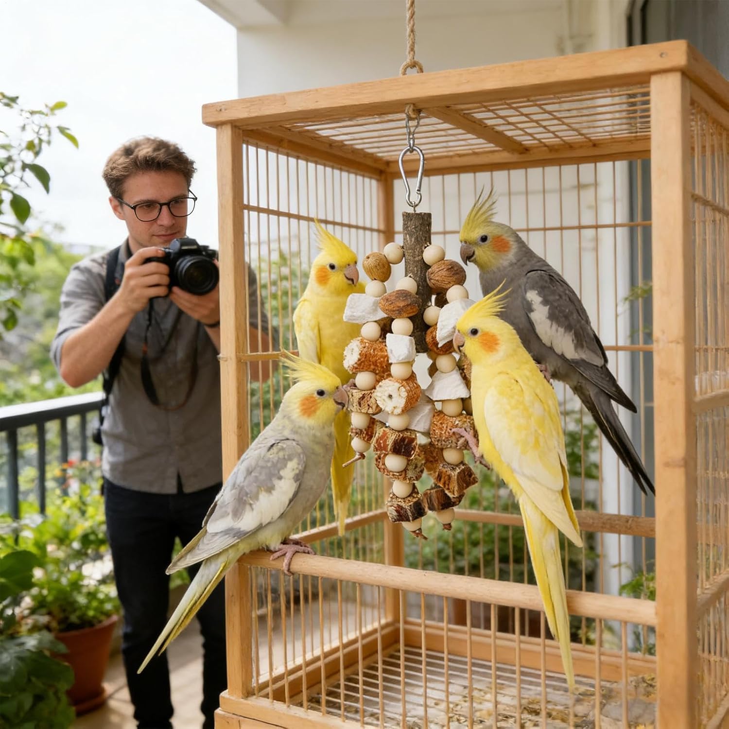 Sofortige Spielintegration: Das Design für eine werkzeuglose Installation und die robusten Metallhaken erleichtern die Montage und ermöglichen einen sofortigen Einsatz bei täglichen Aufgaben. Fördert natürliches Verhalten wie Nagen und Halten, was zum allgemeinen Wohlbefinden der gefiederten Begleiter beiträgt.