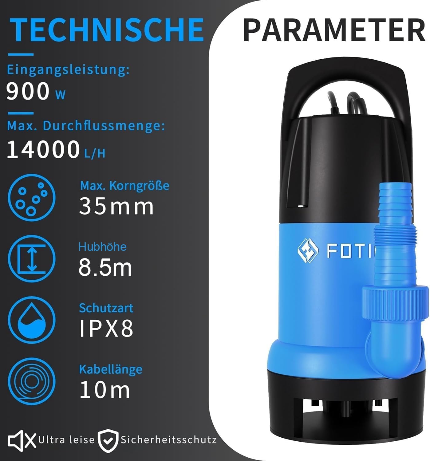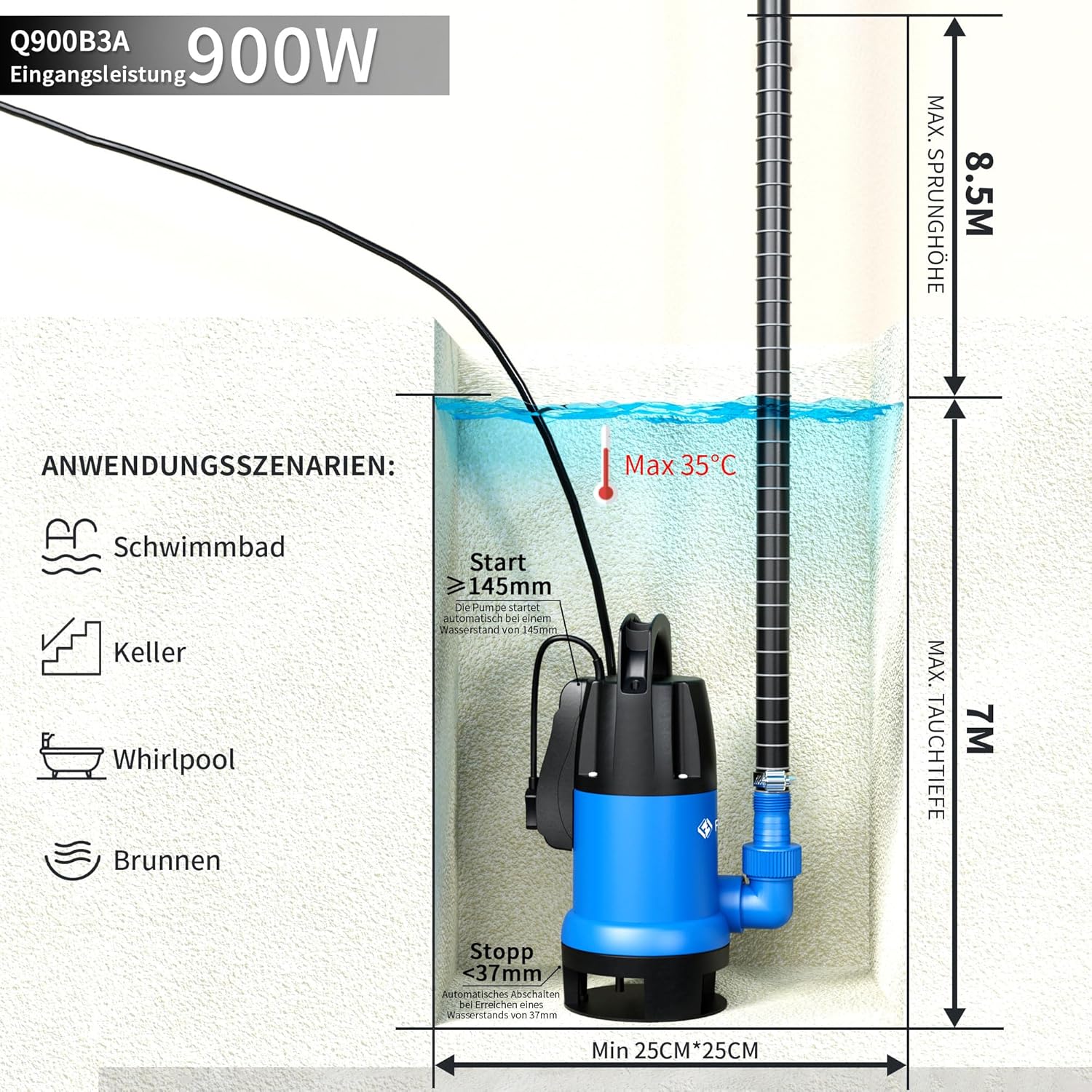 【900 W Leistung – hohe Effizienz】 Diese Wasserpumpe verfügt über einen energieeffizienten Motor mit einer Förderleistung von bis zu 14.000 l/h und einer maximalen Förderhöhe von 8,5 m. Ideal zum Entleeren von Teichen, Pools, Whirlpools und anderen Gewässern bis zu einer Tiefe von 7 m.