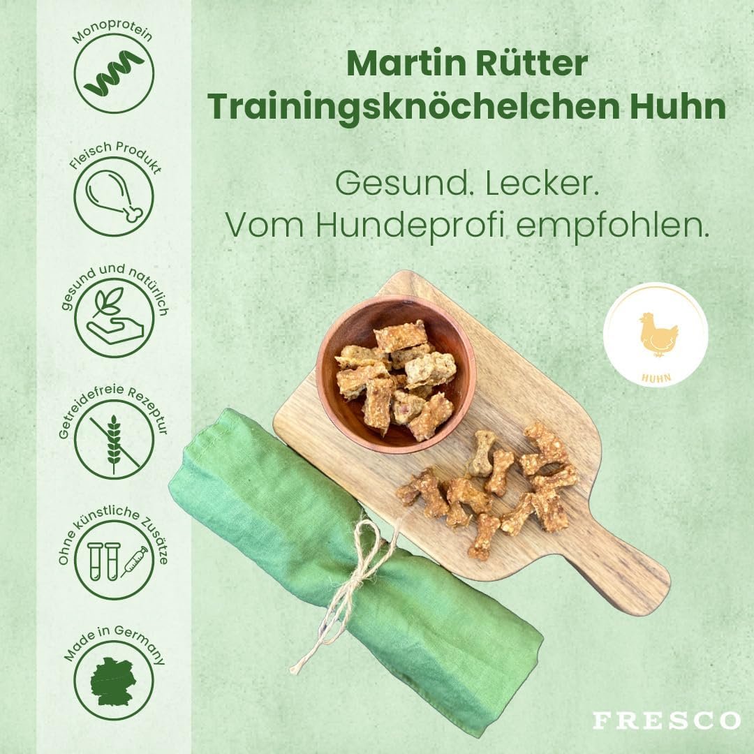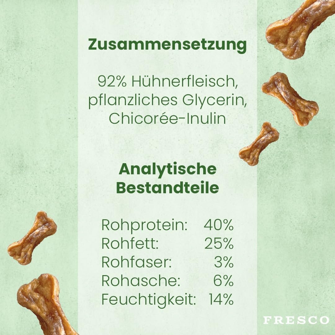 Monoprotein Huhn 92 %: Mit nur einer tierischen Proteinquelle ist der FRESCO Trainingsknöchel sehr schmackhaft und verträglich. Unsere Hundesnacks werden ausschließlich aus frischen Zutaten hergestellt und verzichten auf unnötige Aromen und Konservierungsstoffe