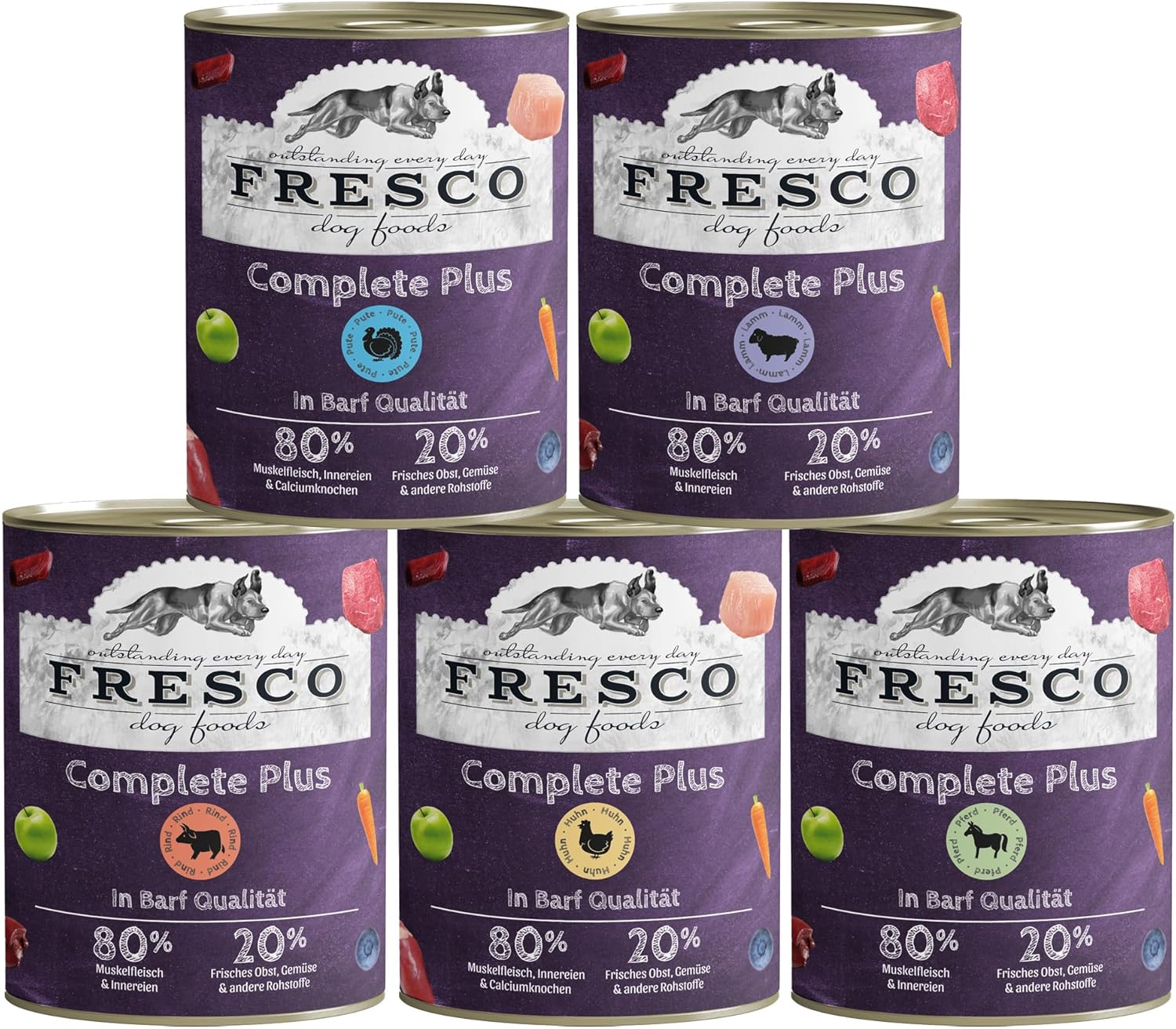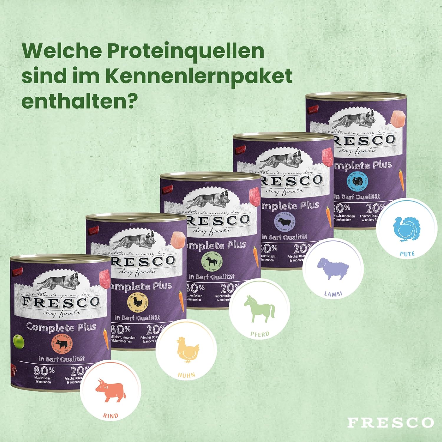 Probierset und Monoprotein. Testen Sie einfach 5 leckere Sorten im Vorteilspack – perfekt für BARF-Einsteiger. Jeder FRESCO NassBarf Complete Plus enthält nur eine tierische Proteinquelle und keine künstlichen Zusatz- oder Konservierungsstoffe