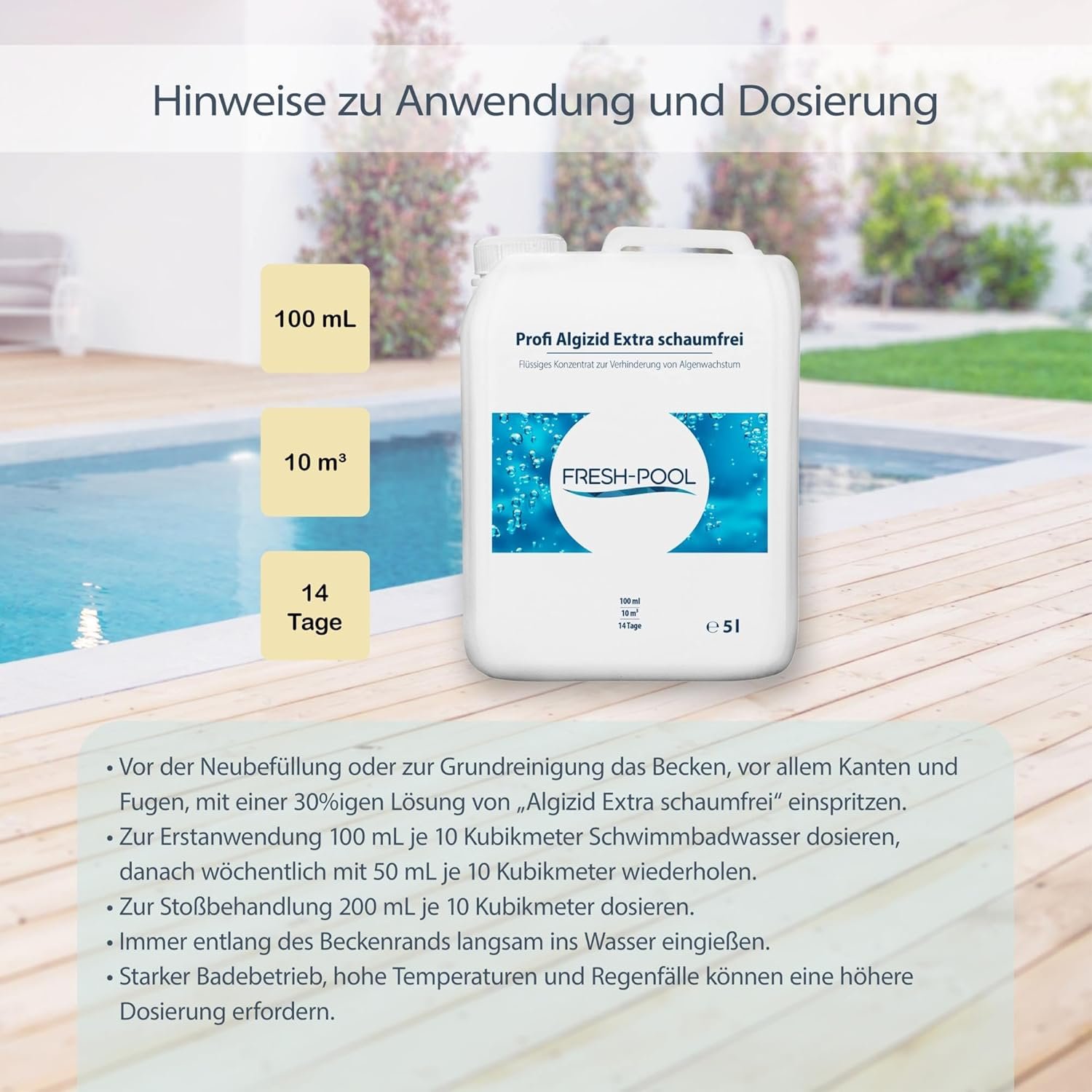 Zur Erstanwendung 100 mL je 10 m³ Schwimmbadwasser dosieren, danach wöchentlich mit 50 mL je 10 m³ wiederholen.