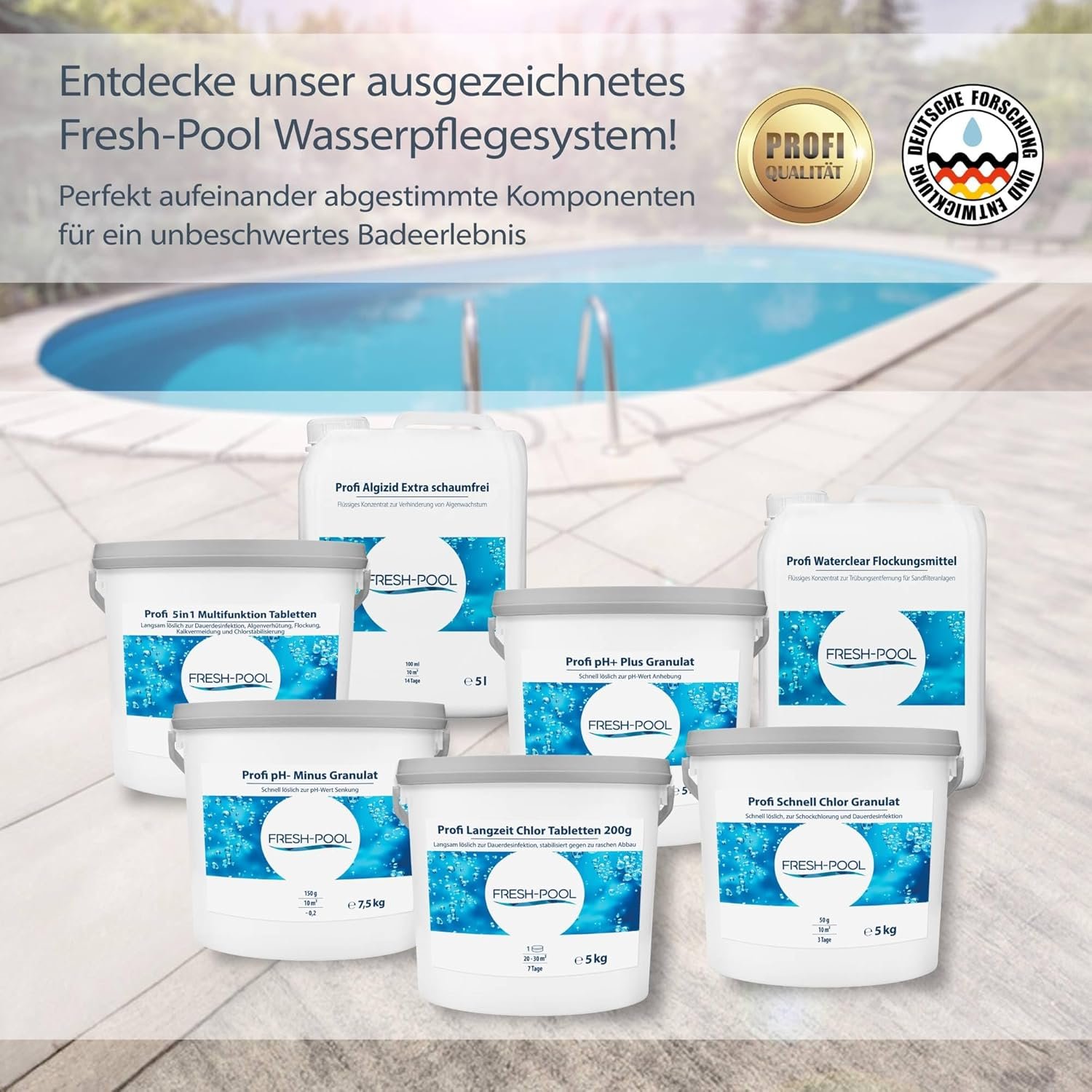 Vertrauen Sie auf Fresh-Pool Wasserpflegeprodukte für eine professionelle Poolpflege mit glasklarem Wasser!