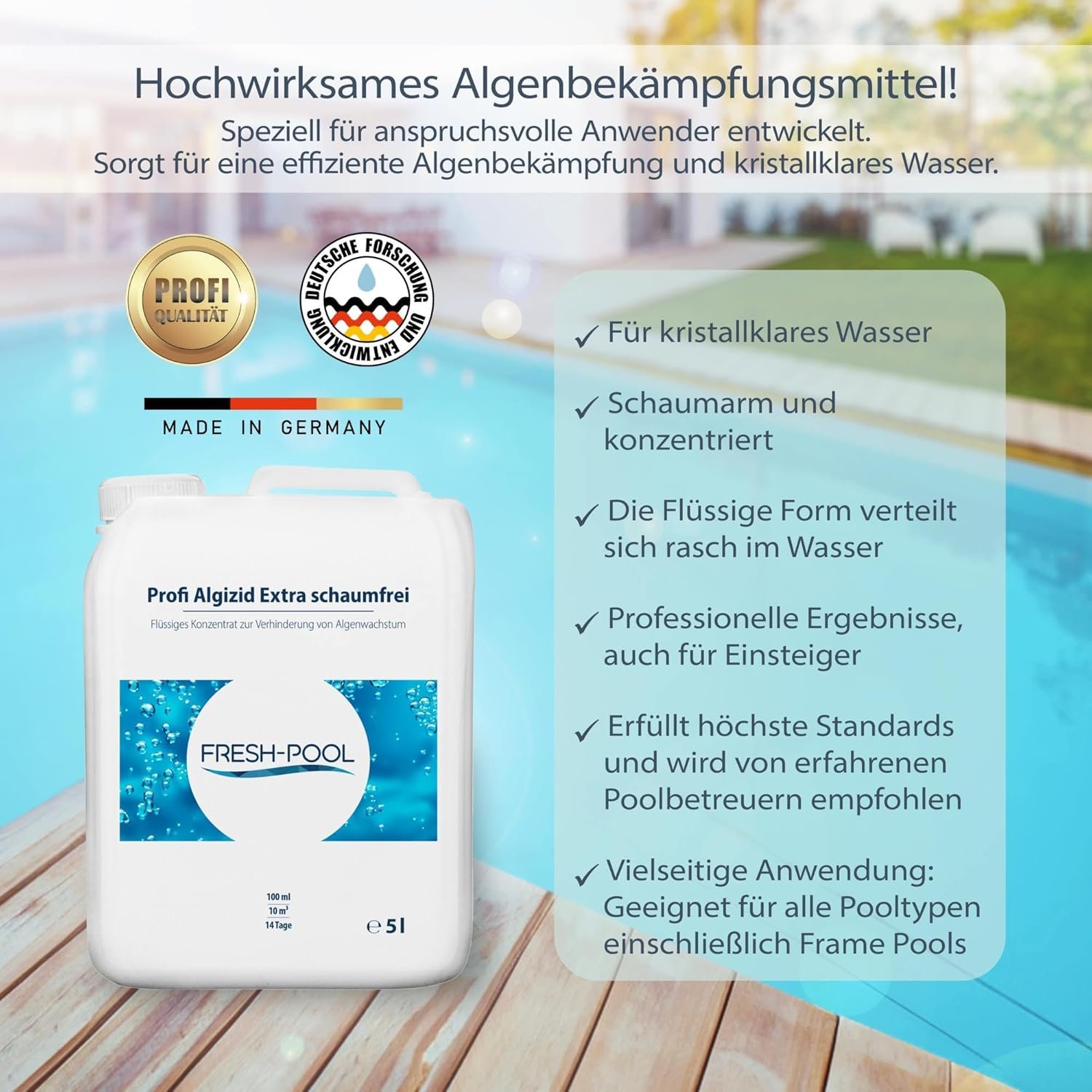 Fresh-Pool Algizid Schaumfrei erfüllt höchste Standards und wird von erfahrenen Poolbetreuern empfohlen.