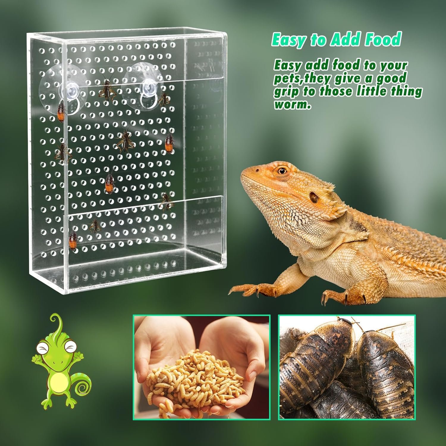 Sichere Insektenaufbewahrung und einfach zu verwenden. Dieser durchsichtige Bartagamen-Futterspender aus Acryl wurde speziell für die sichere Aufbewahrung von Insekten entwickelt. Der abgedeckte Aufbau verhindert das Entweichen der Futtertiere und sorgt so für eine stressfreie Fütterung Ihres Chamäleons.