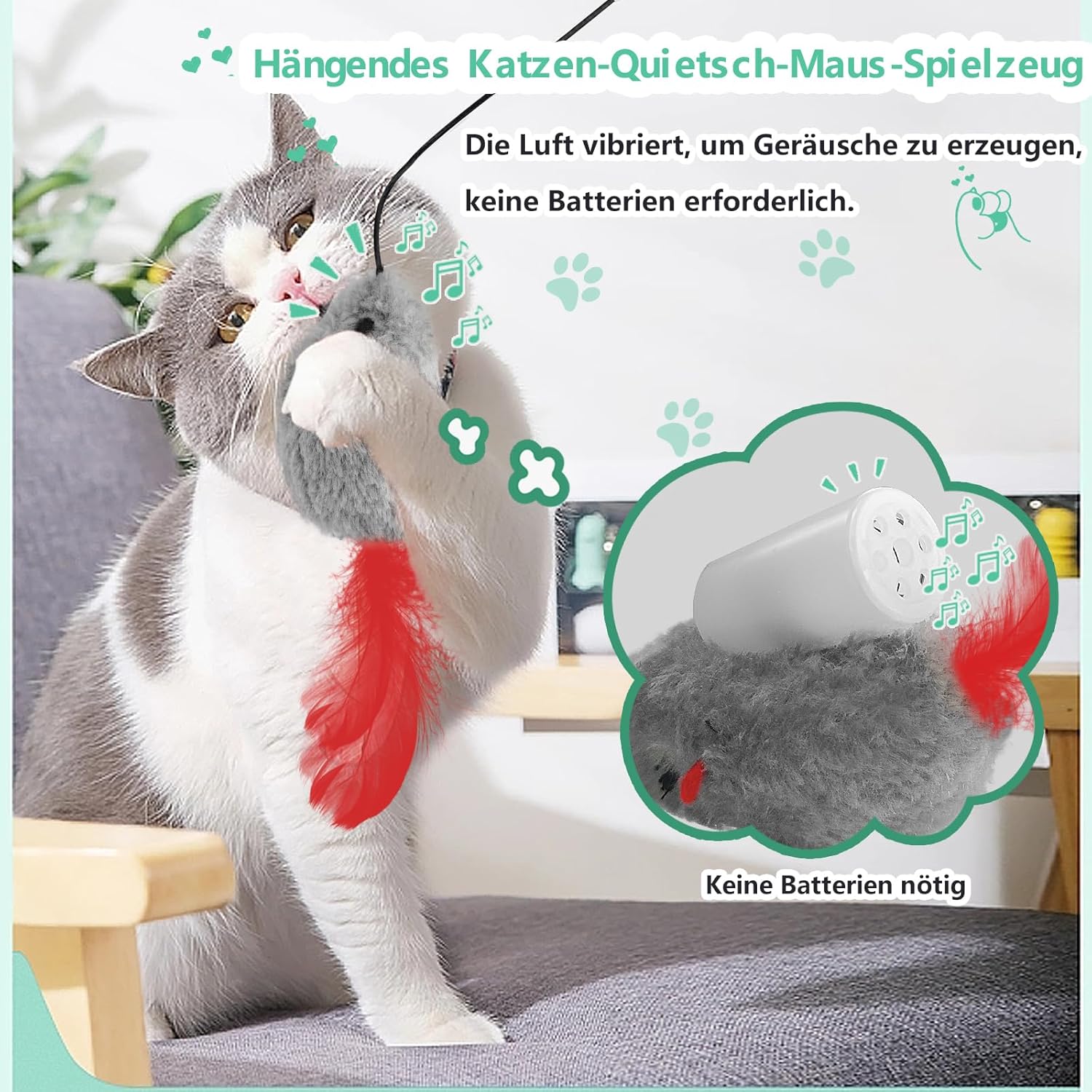VERSTELLBARES ELASTISCHES SEIL Das elastische Seil kann auf die gewünschte Höhe eingestellt werden, sodass die Maus von der Katze herumgezogen werden kann, ohne dass sie sich leicht verfängt. Wenn die Katze fängt und loslässt, fliegt die Maus hin und her und quietscht, was dem Spiel ein Element der Unvorhersehbarkeit und Spannung verleiht.